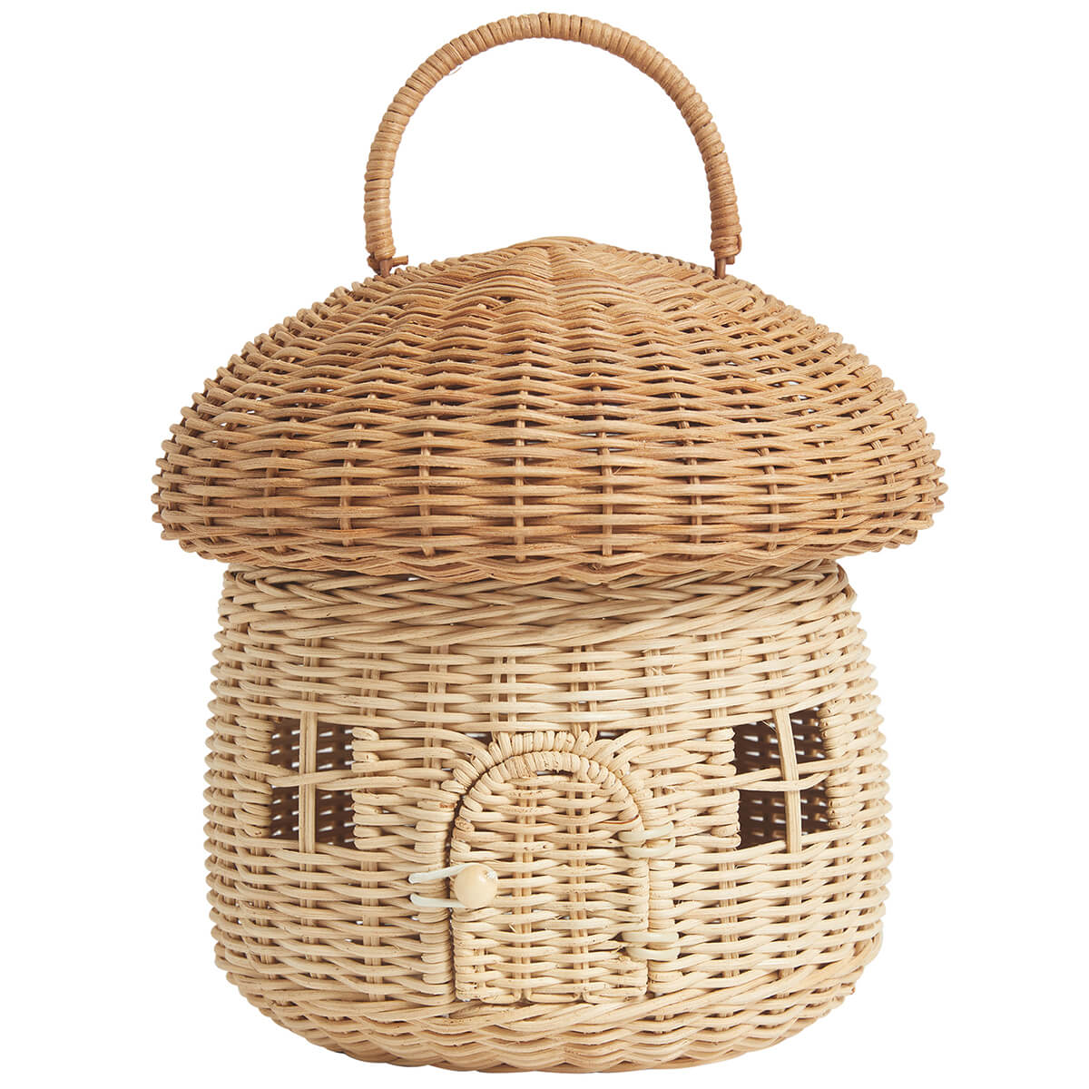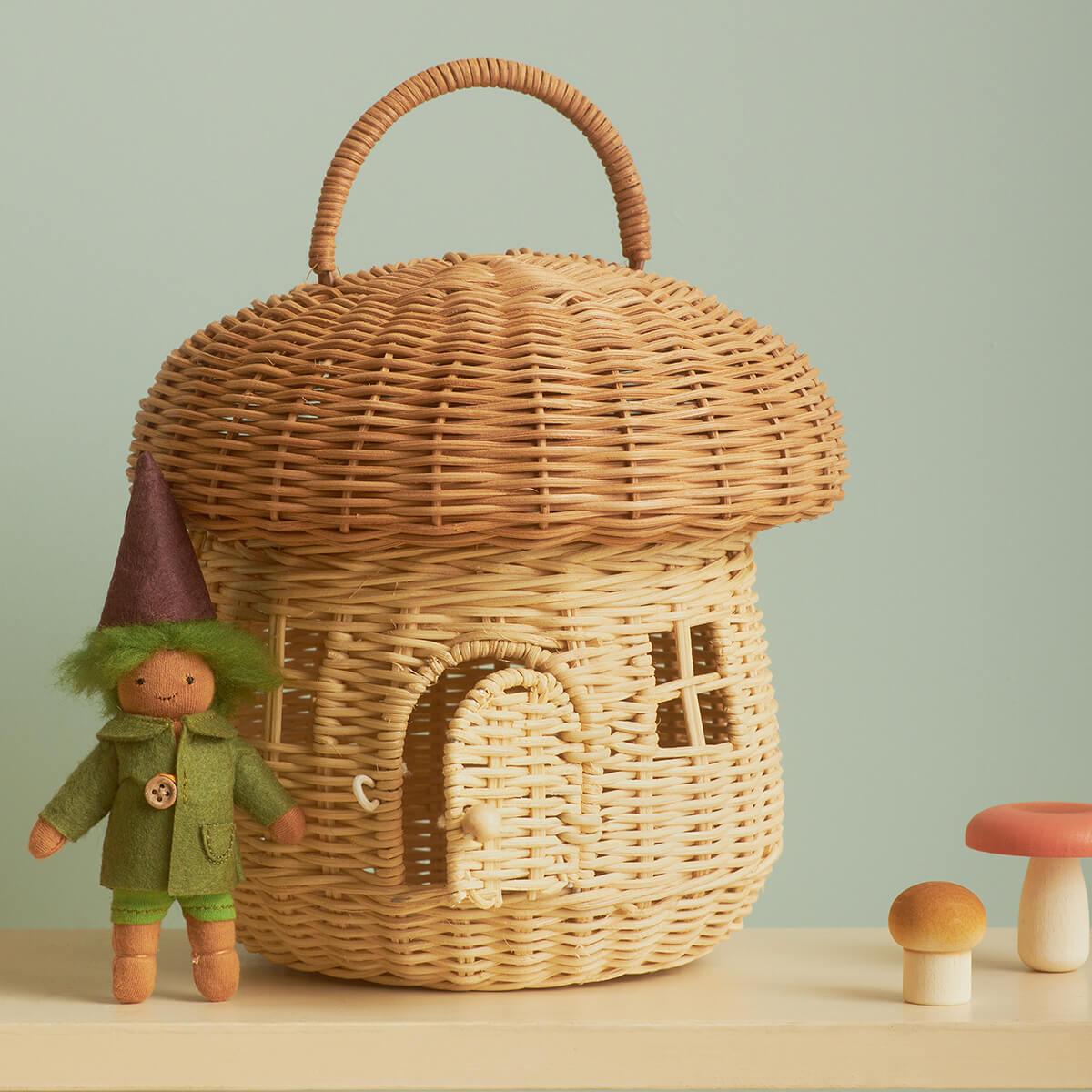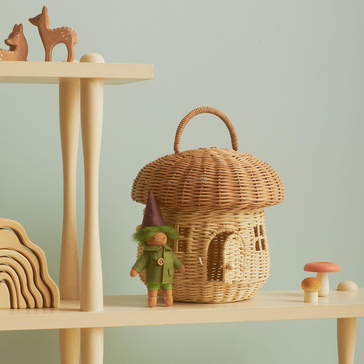 Rattan Mushroom Basket by Olli Ella. The mushroom basket is a magical home for forest dwelling creatures, little animals, fairies, gnomes and so much more. With a generous size, adjustable handle, and a little door (which opens and shuts), kiddos can open the mushroom top and carry teeny treasures with them wherever they go. Designed for adventures on the go, the Mushroom Basket makes the perfect portable home for Holdie Folk too. Made from 100% Natural Rattan, the Mushroom Basket has a flat base and can be displayed upright. Use it as a carry bag or decorative basket.
