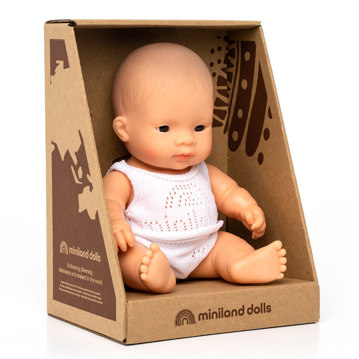 Asian boy baby doll by Miniland.  Anatomically correct doll dressed in underwear and lightly vanilla scented to smell like a newborn baby.  With moveable limbs and head, the doll is manufactured from non-toxic Phthalates-free vinyl, which makes it soft and flexible to touch, and very resilient.  The doll can also be bathed.  Comes in an eco-friendly cardboard box.