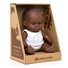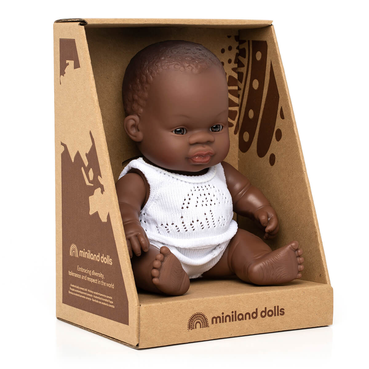 African girl baby doll by Miniland.  Anatomically correct doll dressed in underwear and lightly vanilla scented to smell like a newborn baby.  With moveable limbs and head, the doll is manufactured from non-toxic Phthalates-free vinyl, which makes it soft and flexible to touch, and very resilient.  The doll can also be bathed.  Comes in an eco-friendly cardboard box.