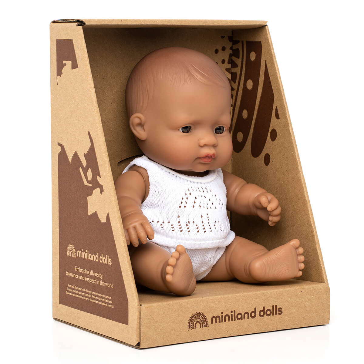 Hispanic girl baby doll by Miniland. Anatomically correct doll dressed in underwear and lightly vanilla scented to smell like a newborn baby. With moveable limbs and head, the doll is manufactured from non-toxic Phthalates-free vinyl, which makes it soft and flexible to touch, and very resilient. The doll can also be bathed. Comes in an eco-friendly cardboard box.