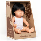 Asian boy doll by Miniland.  Anatomically correct doll dressed in underwear and lightly vanilla scented to smell like a newborn baby.  With moveable limbs and head and sewn on hair, the doll is manufactured from non-toxic Phthalates-free vinyl, which makes it soft and flexible to touch, and very resilient.  The doll can also be bathed. Comes in an eco-friendly cardboard box.