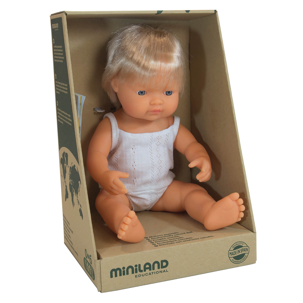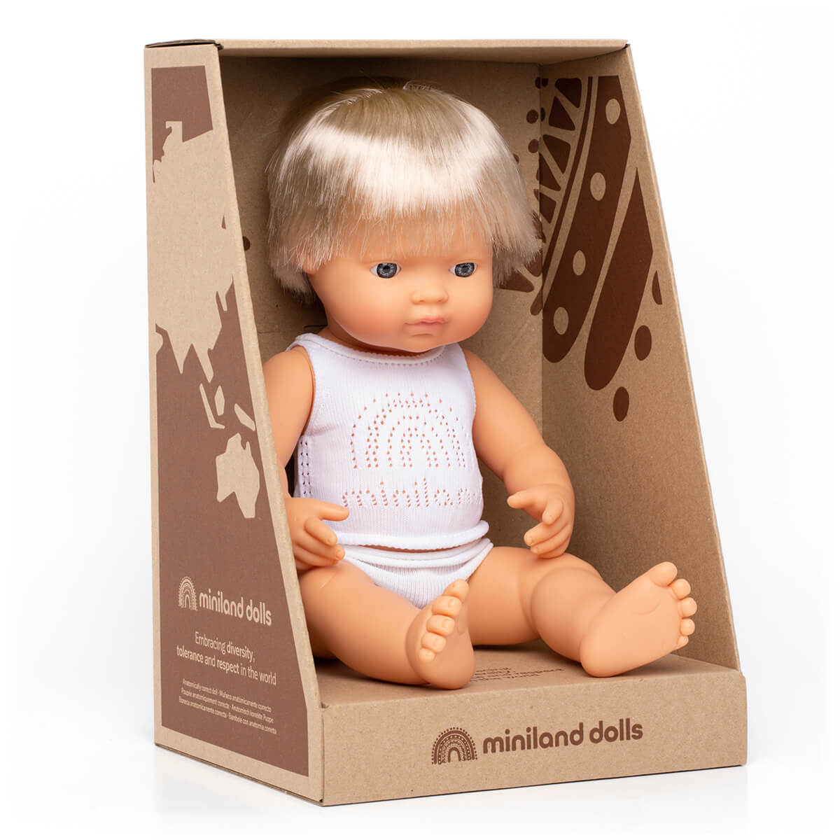 Caucasian boy doll by Miniland. Anatomically correct doll dressed in underwear and lightly vanilla scented to smell like a newborn baby. With moveable limbs and head and sewn on hair, the doll is manufactured from non-toxic Phthalates-free vinyl, which makes it soft and flexible to touch, and very resilient. The doll can also be bathed. Comes in an eco-friendly cardboard box.