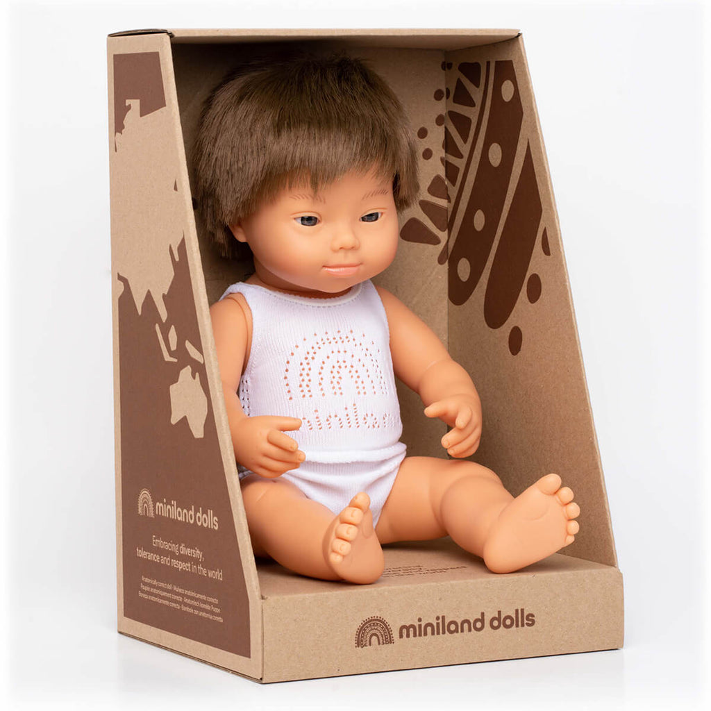 Brown Haired Boy With Down Syndrome by Miniland.  Anatomically correct doll dressed in underwear and lightly vanilla scented to smell like a newborn baby.  With moveable limbs and head and sewn on hair, the doll is manufactured from non-toxic Phthalates-free vinyl, which makes it soft and flexible to touch, and very resilient.  The doll can also be bathed.  Comes in an eco-friendly cardboard box.