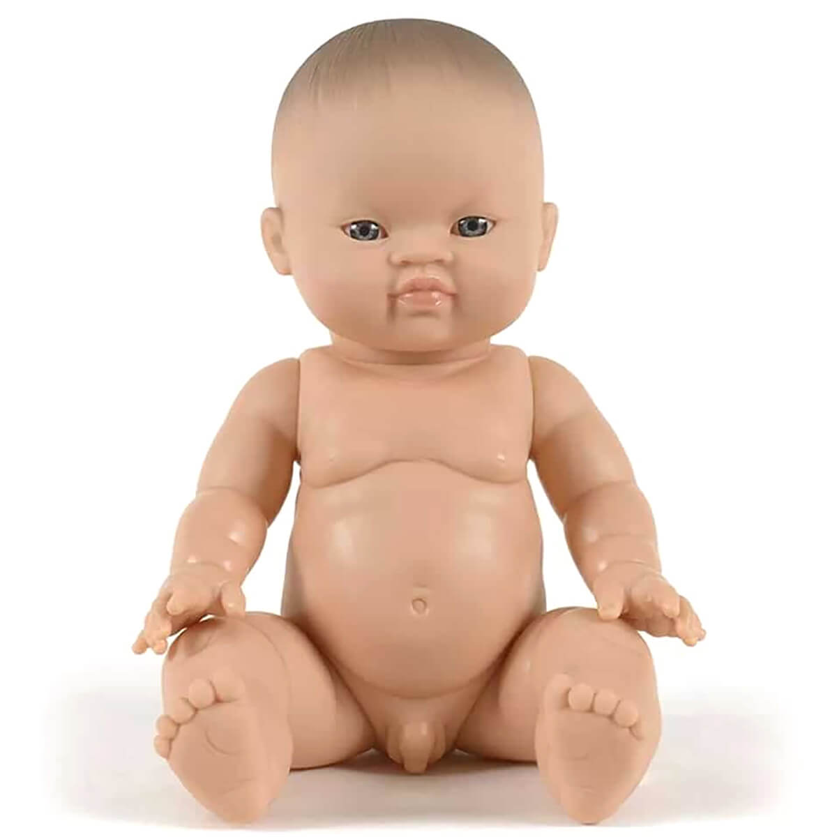 Elio Asian boy doll with light eyes by Minikane X Paola Reina. Anatomically correct doll lightly vanilla scented to smell like a newborn baby. With moveable limbs and head, the doll is manufactured from non-toxic Phthalates-free vinyl, which makes it soft and flexible to touch, and very resilient. The doll can also be bathed.