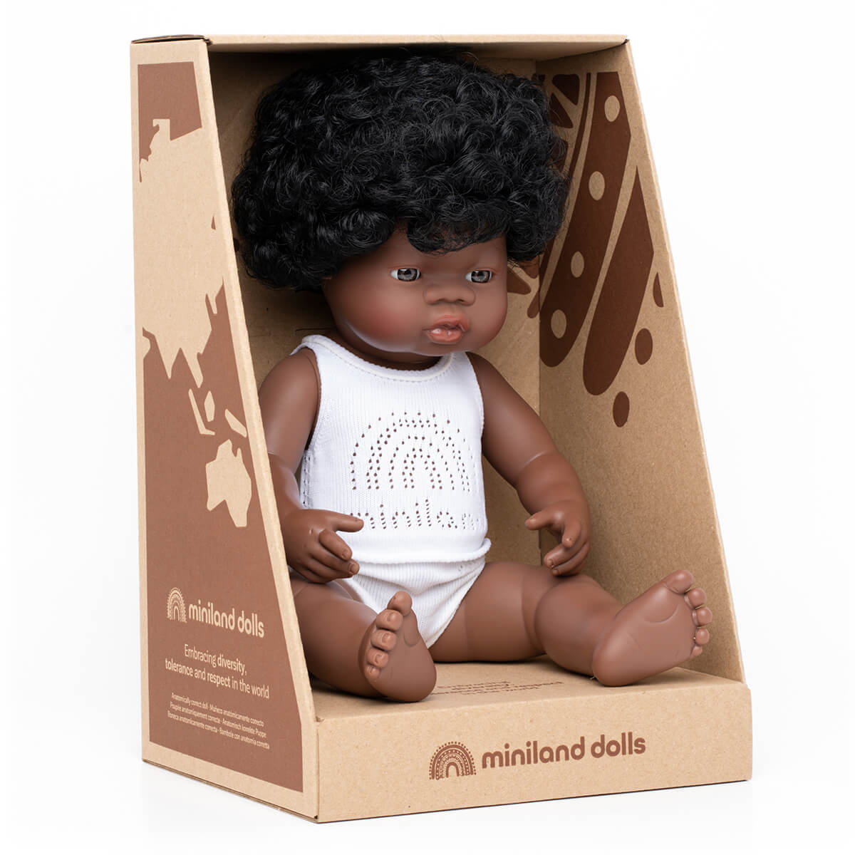 African girl doll by Miniland.  Anatomically correct doll dressed in underwear and lightly vanilla scented to smell like a newborn baby. With moveable limbs and head and sewn on hair, the doll is manufactured from non-toxic Phthalates-free vinyl, which makes it soft and flexible to touch, and very resilient.  The doll can also be bathed. Comes in an eco-friendly cardboard box.