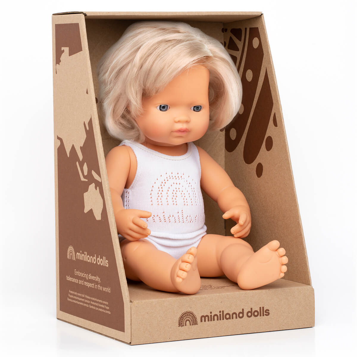 Caucasian girl doll by Miniland. Anatomically correct doll dressed in underwear and lightly vanilla scented to smell like a newborn baby. With moveable limbs and head and sewn on hair, the doll is manufactured from non-toxic Phthalates-free vinyl, which makes it soft and flexible to touch, and very resilient. The doll can also be bathed. Comes in an eco-friendly cardboard box.