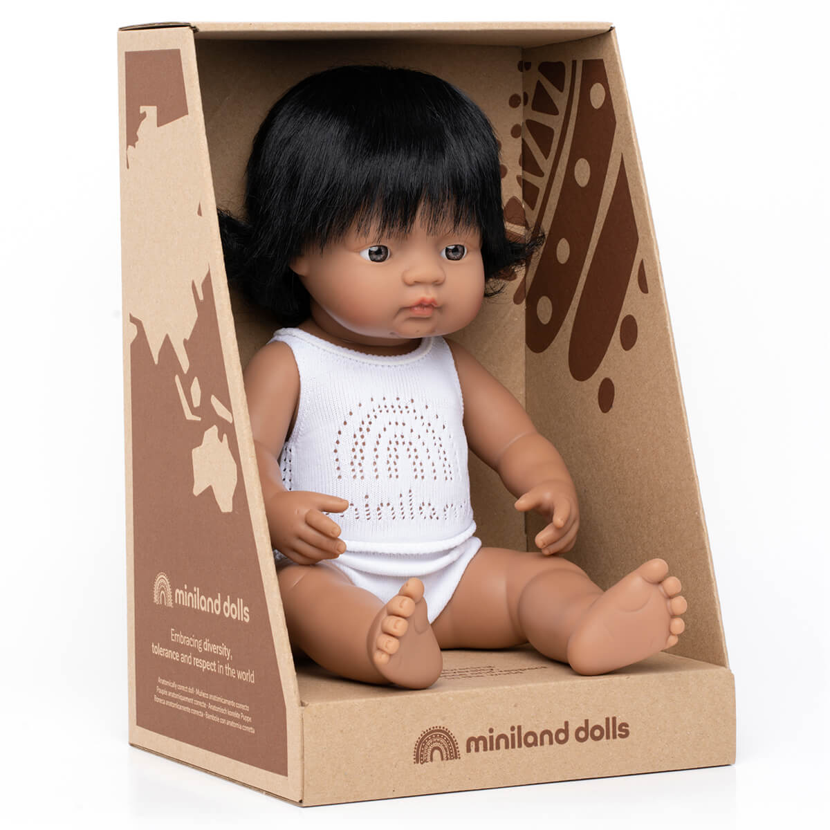 Hispanic girl doll by Miniland. Anatomically correct doll dressed in underwear and lightly vanilla scented to smell like a newborn baby. With moveable limbs and head and sewn on hair, the doll is manufactured from non-toxic Phthalates-free vinyl, which makes it soft and flexible to touch, and very resilient. The doll can also be bathed. Comes in an eco-friendly cardboard box.