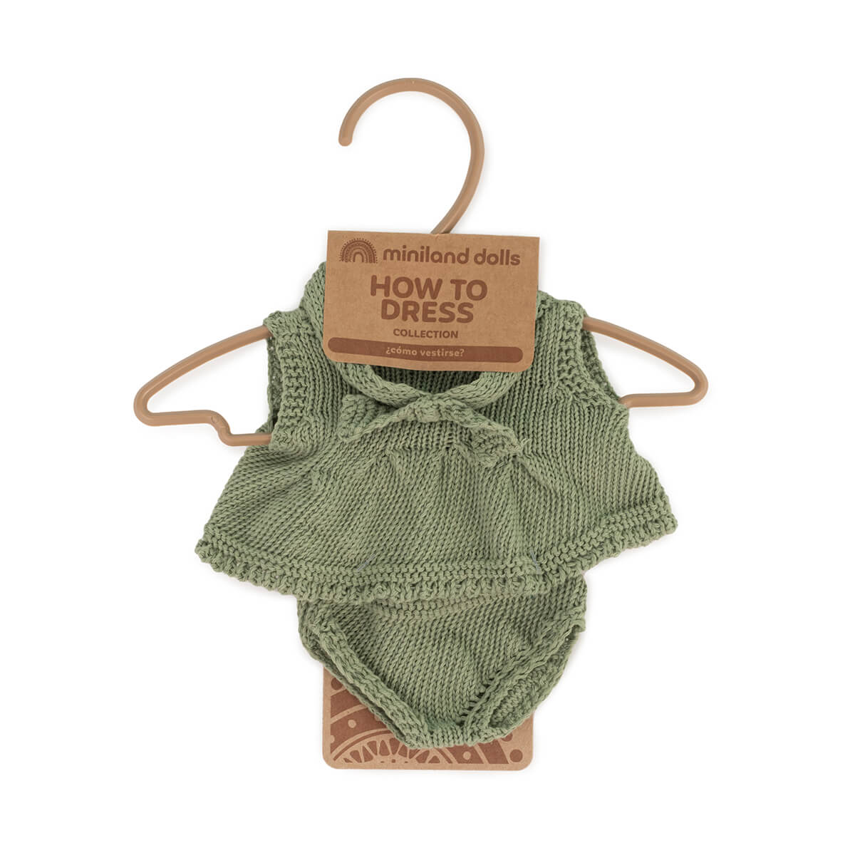 Knitted Doll Outfit by Miniland. A sweet knitted dress and headband outfit for your Miniland doll. Fits all 21cm dolls and comes with a clothes hanger.