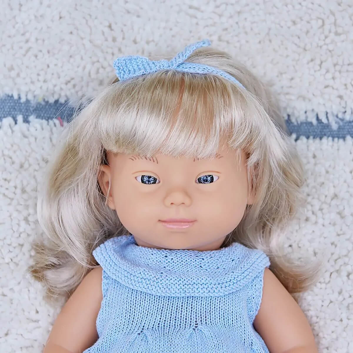 Knitted Doll Outfit by Miniland. A sweet knitted dress and headband outfit for your Miniland doll. Fits all 38cm dolls and comes with a clothes hanger.