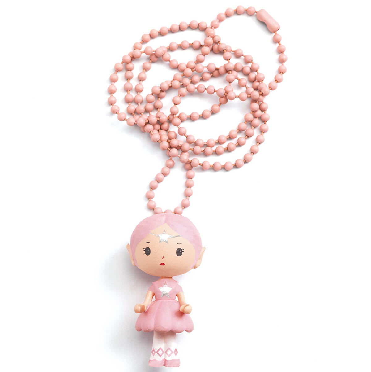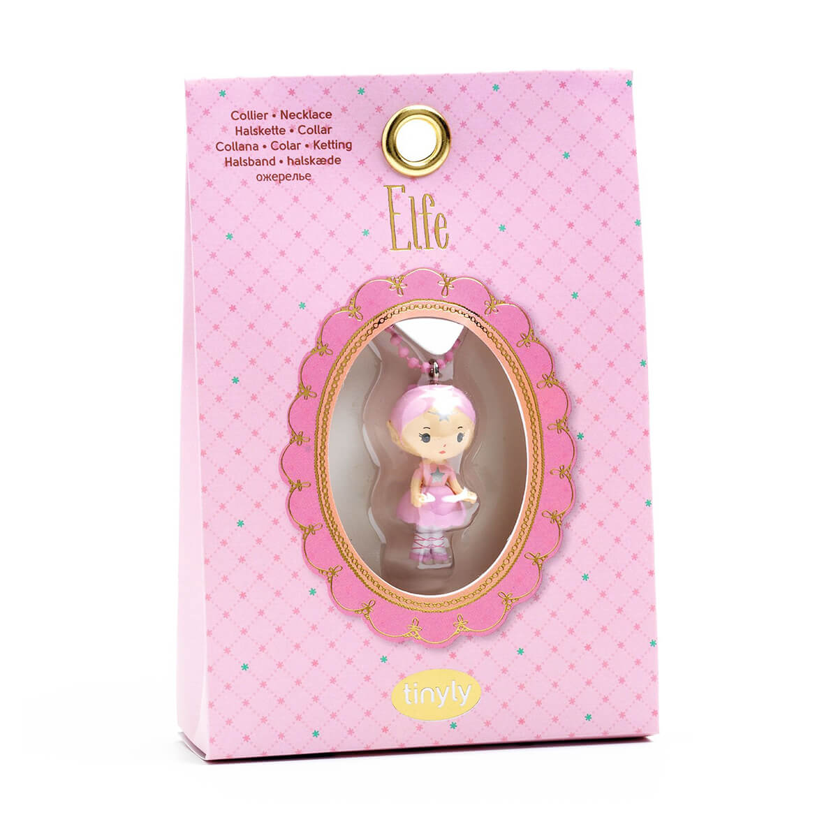 Tinyly Elf Charm Necklace by Djeco. A necklace with a pendant featuring the finely sculpted Tinyly Elf figurine on a colourful adjustable metal chain with a clasp. Comes in a pretty printed pouch and a perfect little gift for someone special.