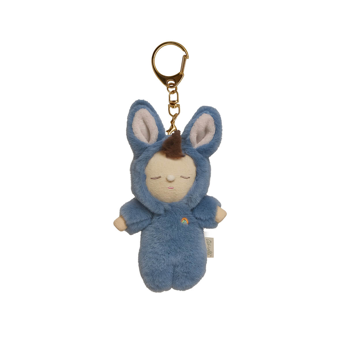 Twiggy Bunny Cozy Dinkum Bag Charm by Olli Ella. Meet Twiggy, a soft blue bunny with tall, pointy ears in a pocket-ready charm. This tiny plush bag charm is a snug little take on the beloved Cozy Dinkum, ready to clip to your keys, backpack, belt or handbag for snuggly adventures wherever you go.