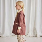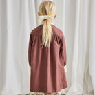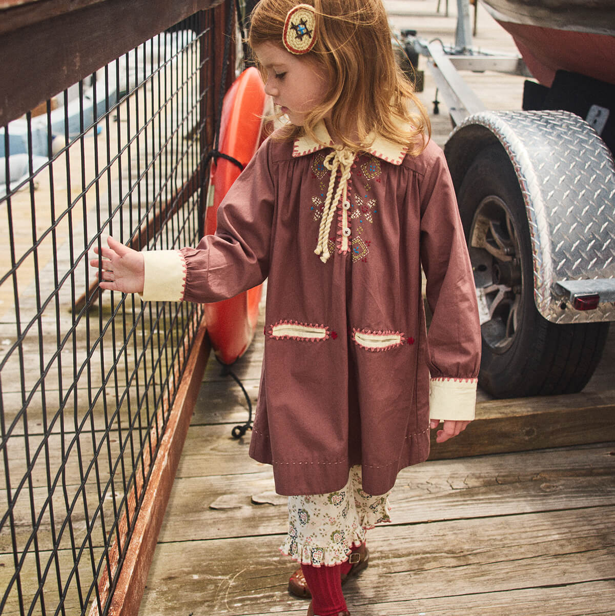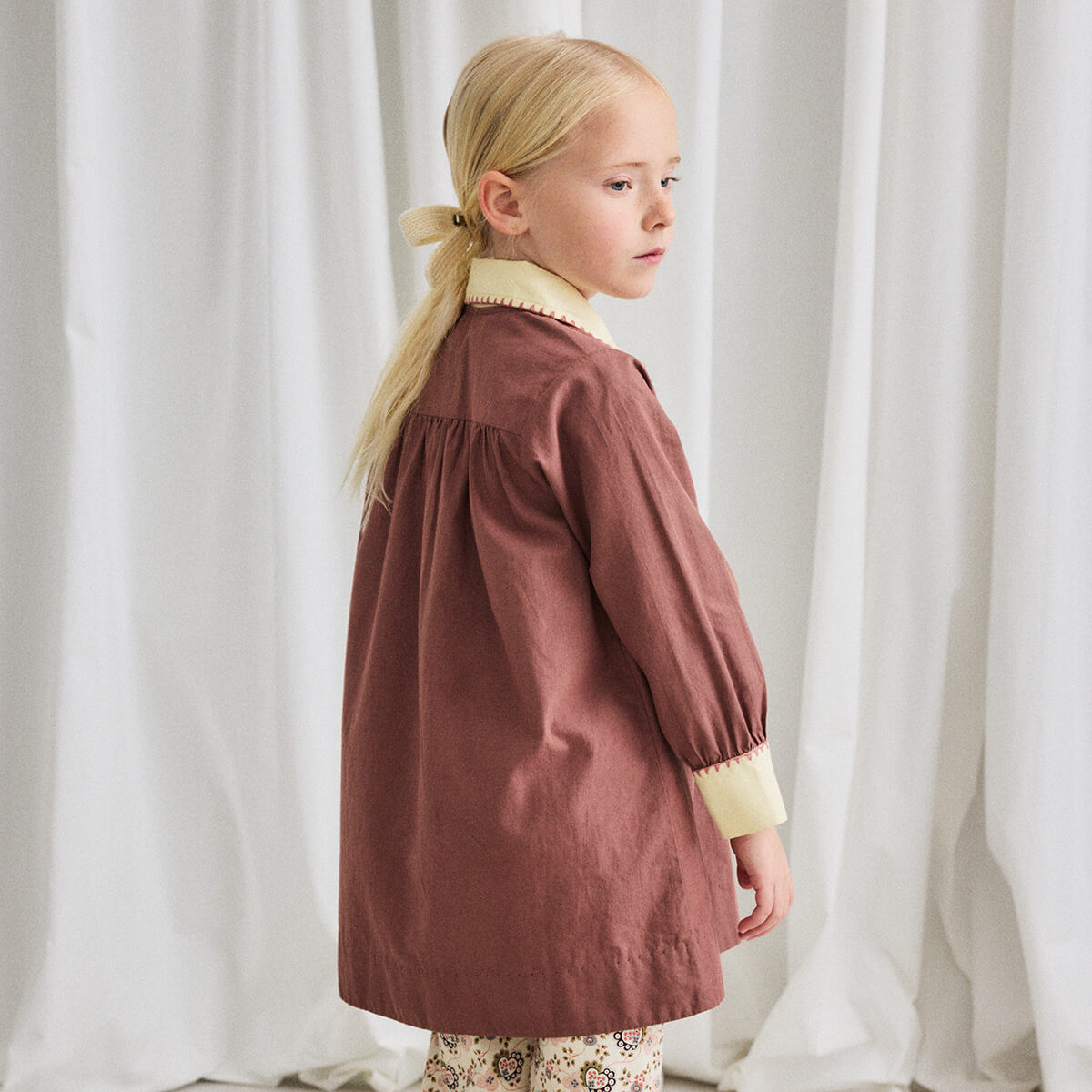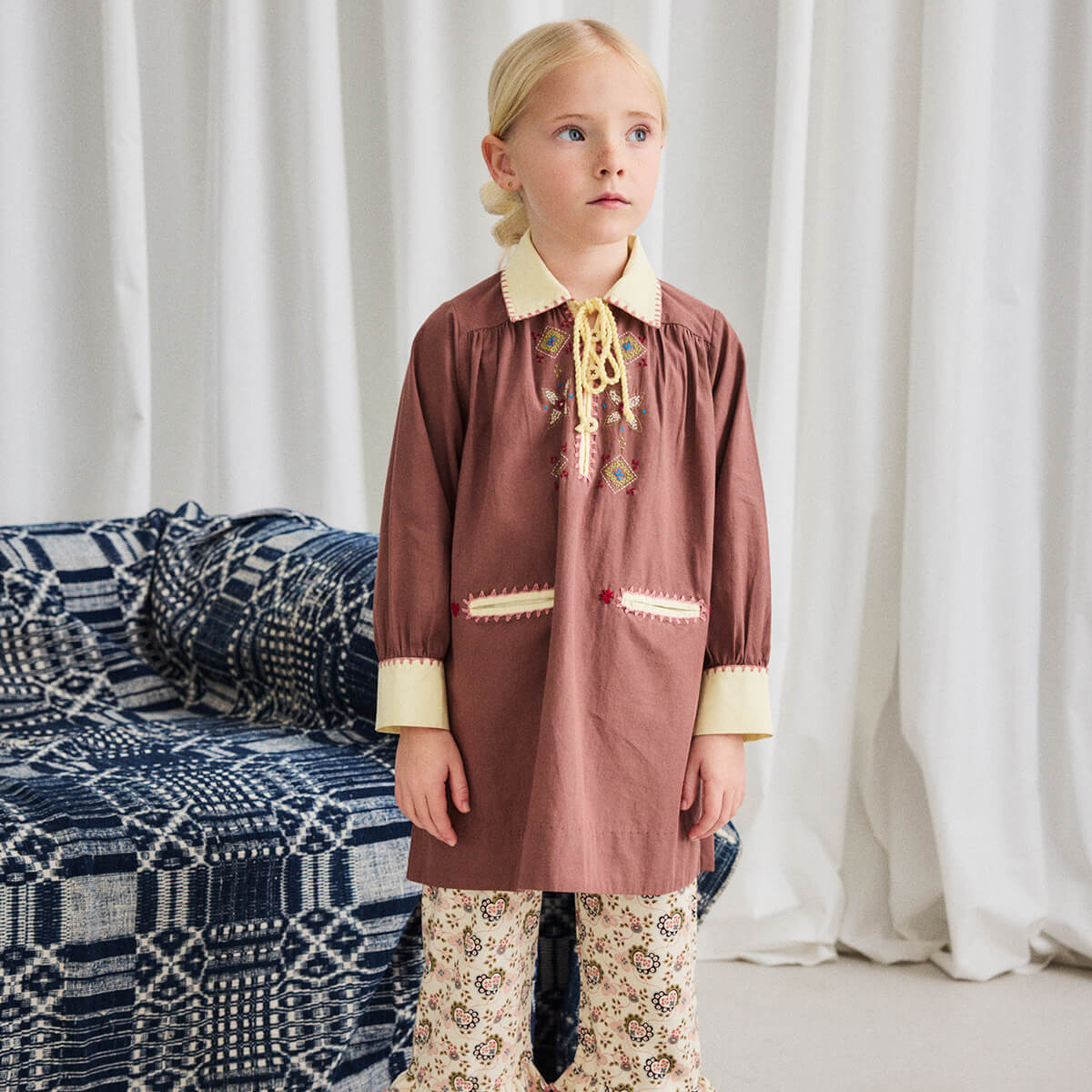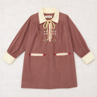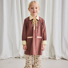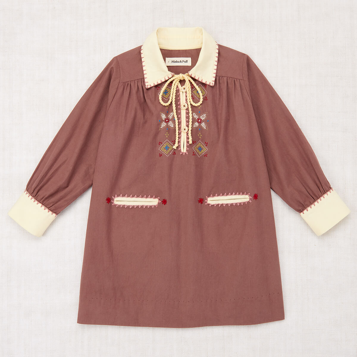 Anita Dress by Misha & Puff. A long-sleeved dress in cotton poplin, featuring a gathered yoke and contrast point collar and placket with corozo button closure. Designed with a corded rope necktie, two front pockets, and contrast cuffed sleeves. Finished with hand-embroidered trim and French seams.