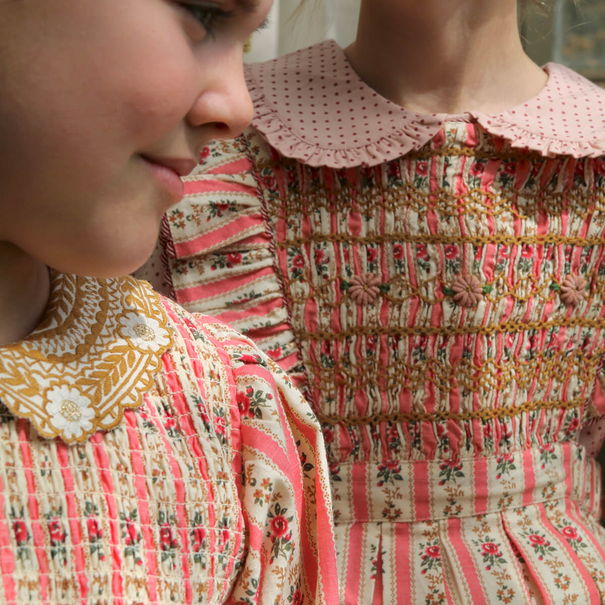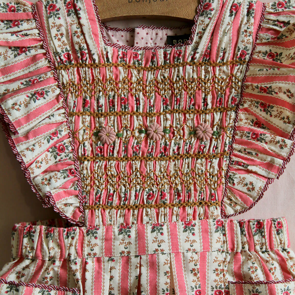 Apron Dress by Bonjour. Bonjour's signature apron dress in a seasonal floral print with a pink dot lining.