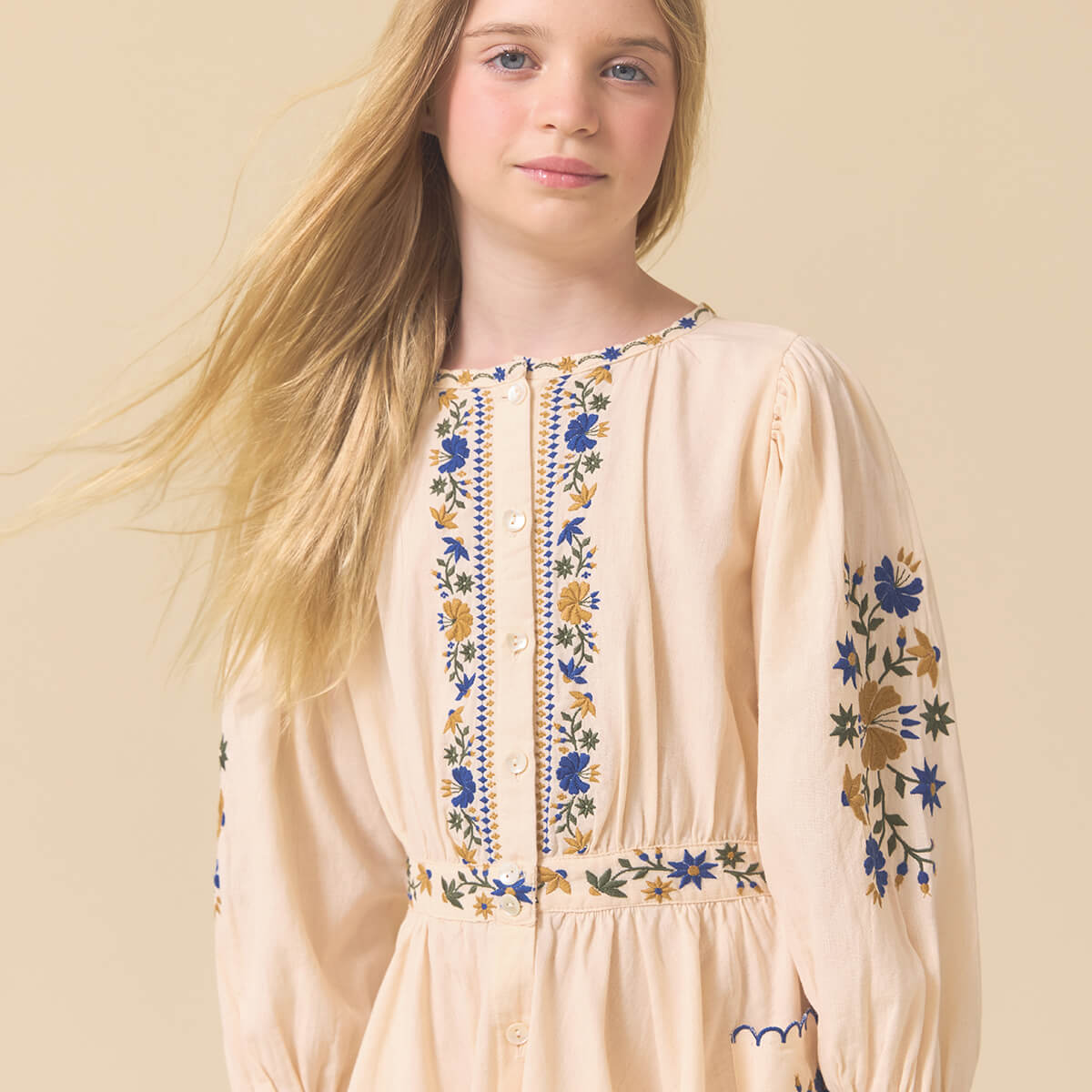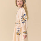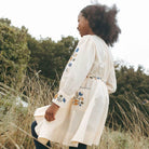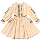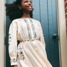 Blair Dress by Lali. Delicate embroidery traces the bodice and cuffs, adding quiet charm to its vintage-inspired silhouette. Soft gathers at the neckline and a full circle skirt create an easy, twirl-worthy shape, while a row of delicate buttons runs from collar to hem. Thoughtful and timeless, it’s a piece made for cozy celebrations and snow-dusted mornings.