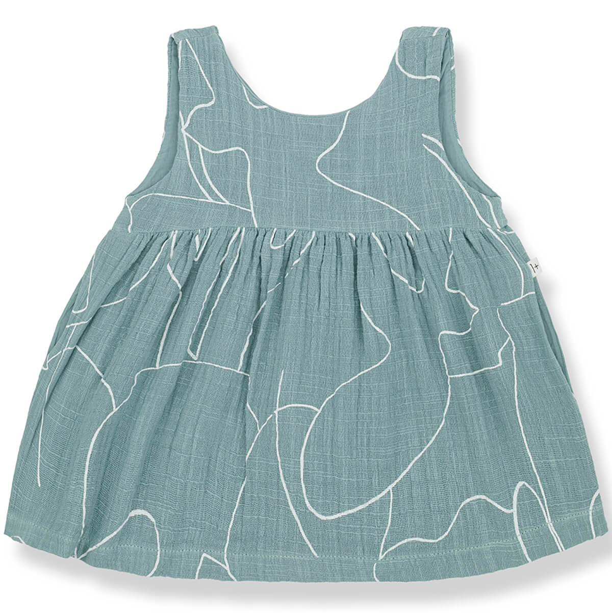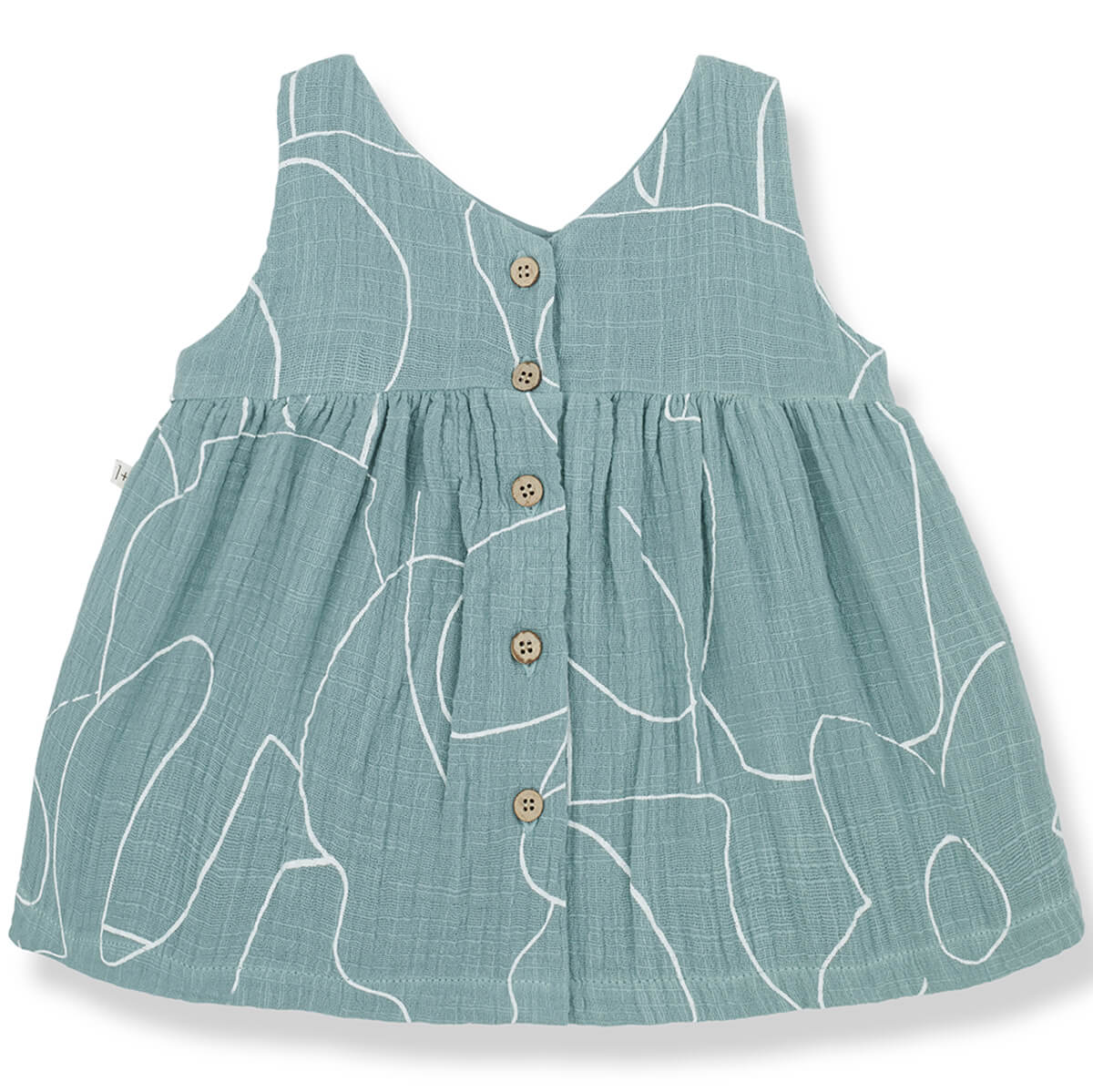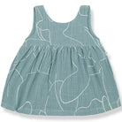 Camelia Dress by 1+ in the Family. Sweet baby dress in a printed textured double face fabric. With wooden button fastenings on the back and gathered waistand.