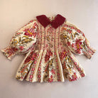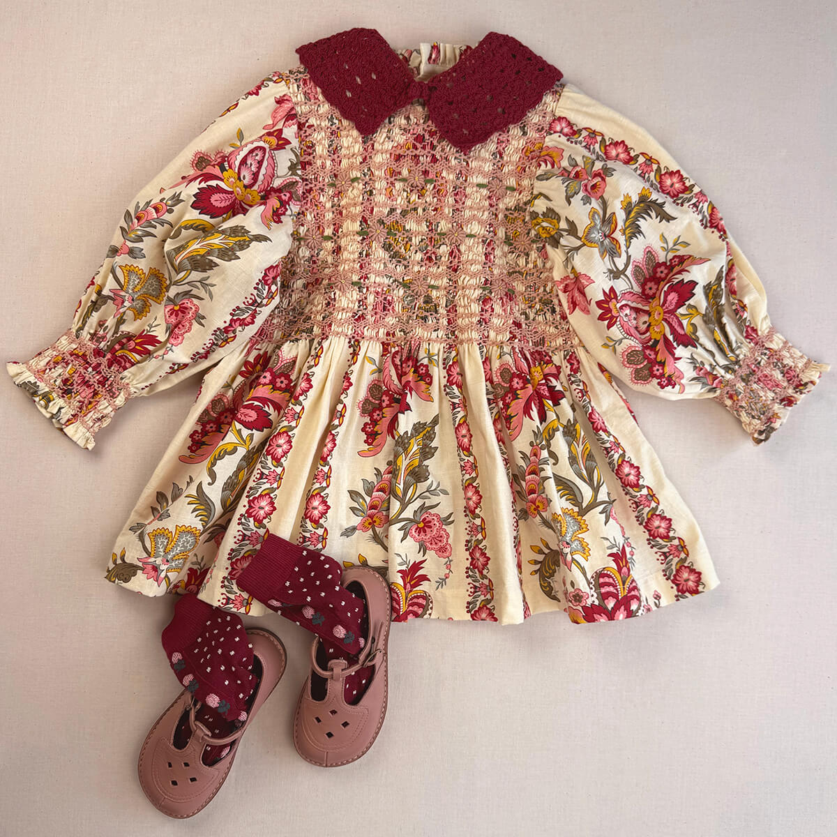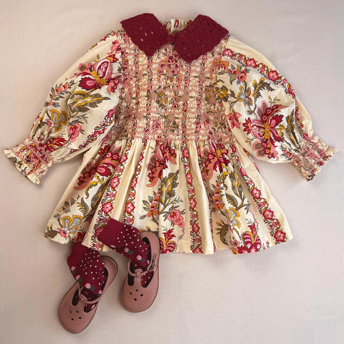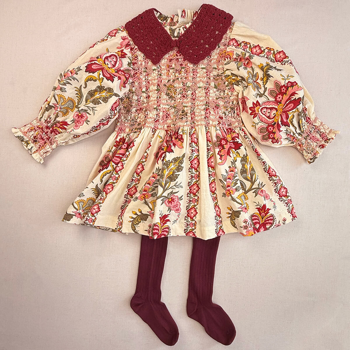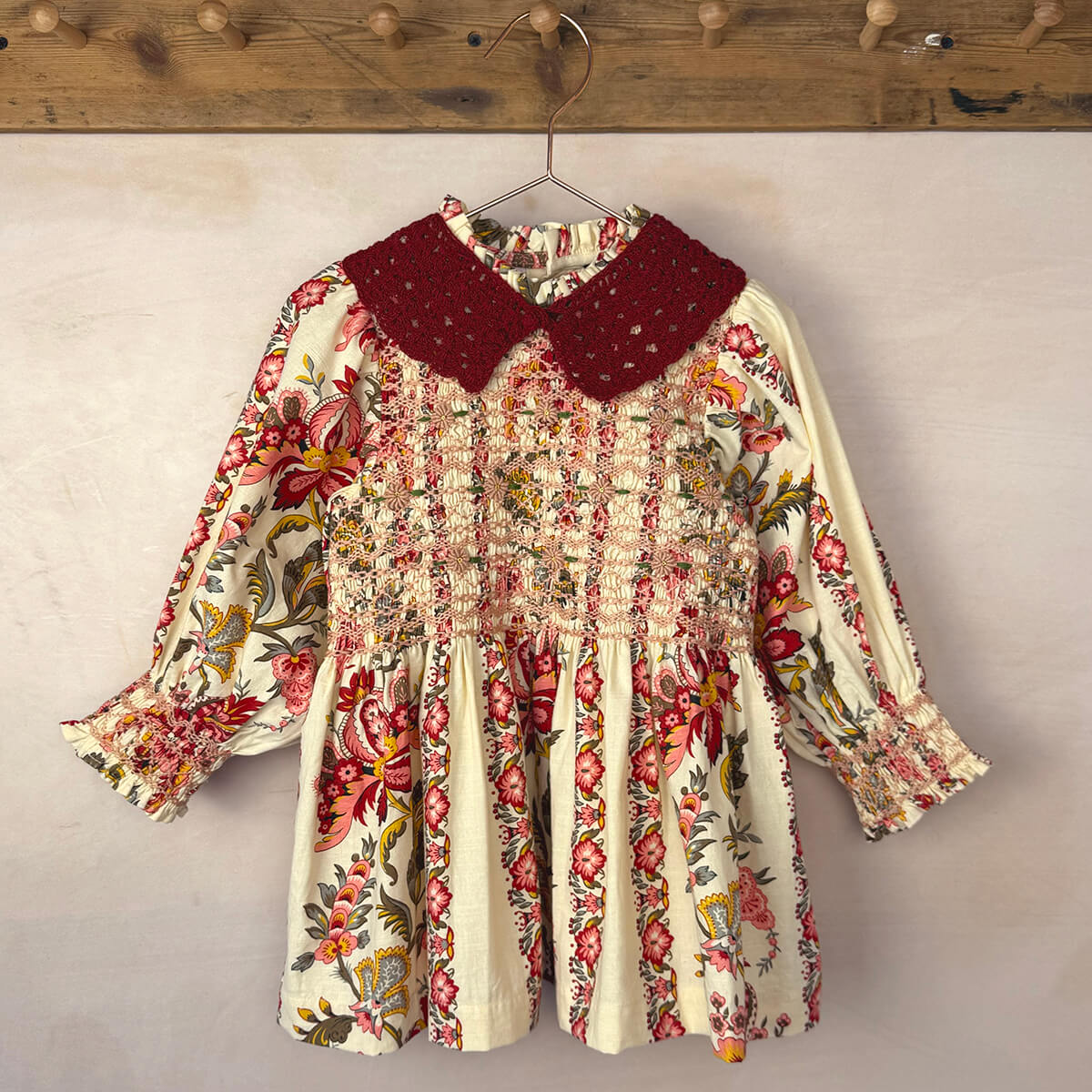 Handsmock Blouse by Bonjour. This pretty blouse in Bonjour's seasonal floral stripe has hand smocking detail and embroidered flowers. Complete with a removable crochet collar in wine.