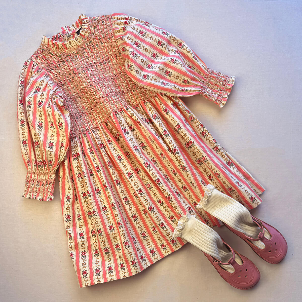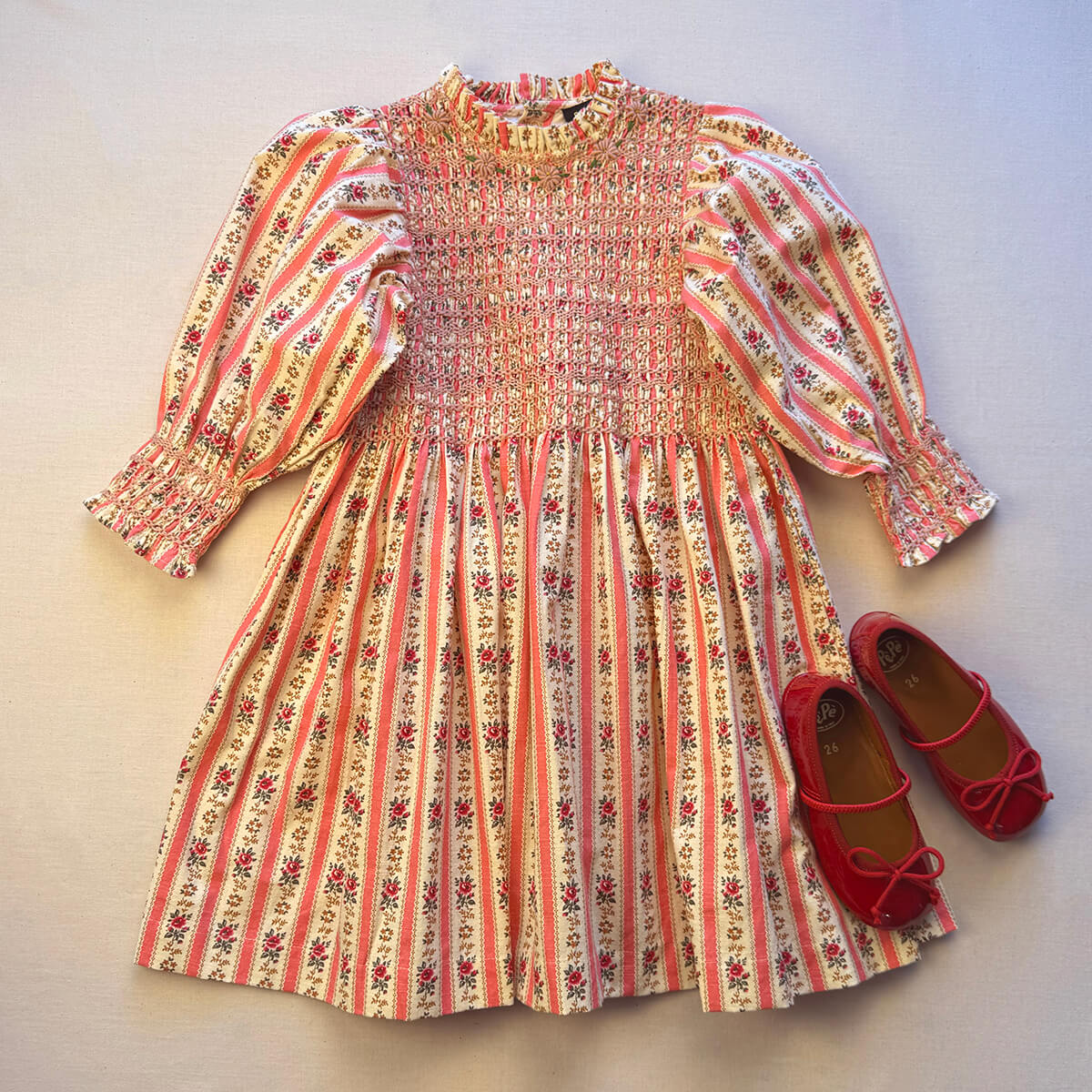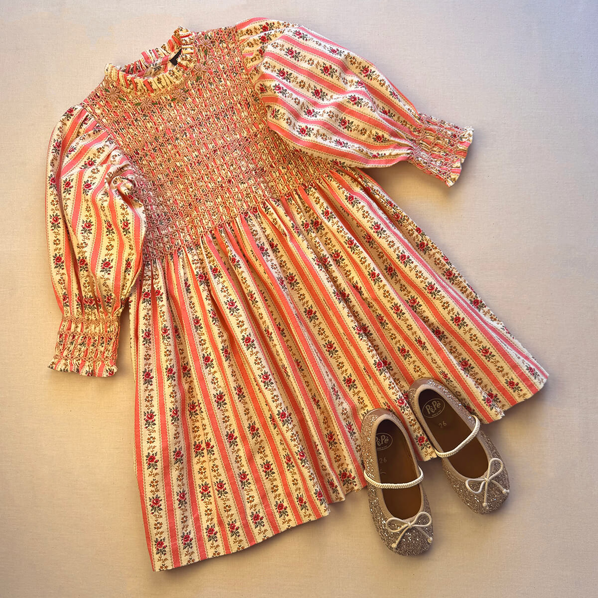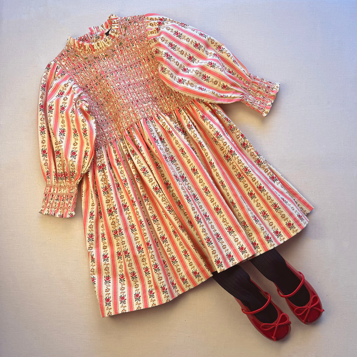 Handsmock Dress by Bonjour. Bonjour's iconic handsmock style in a longer length dress. An exclusive style for us this season, in the beautiful pink tapestry fabric, with pink smocking and embroidered flowers.