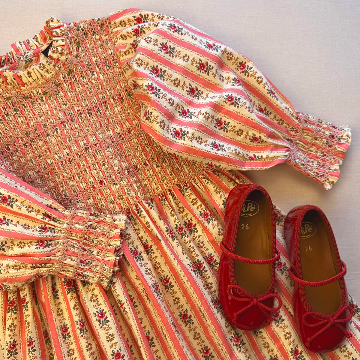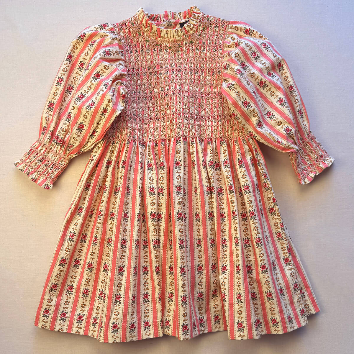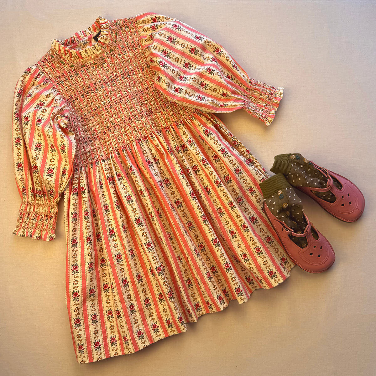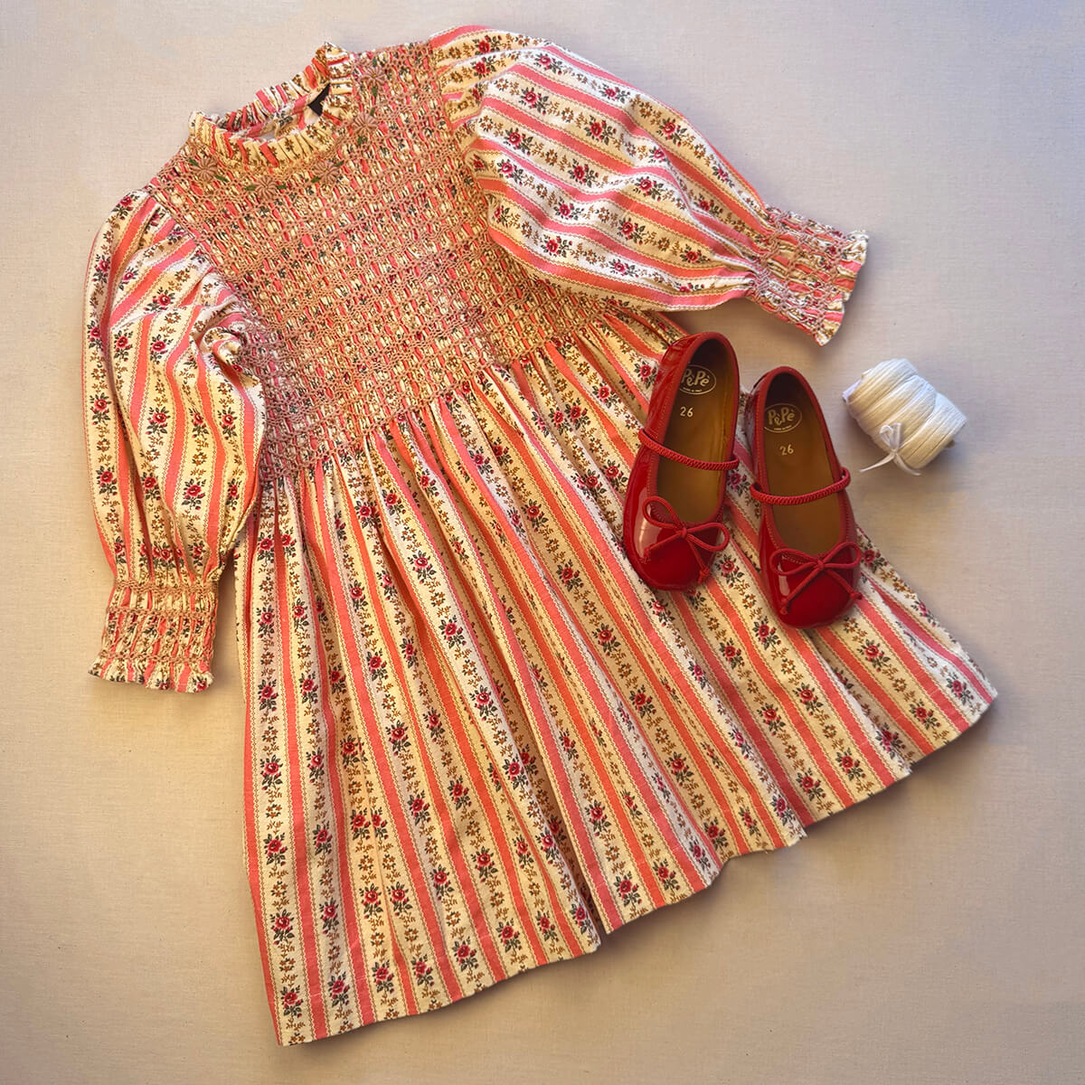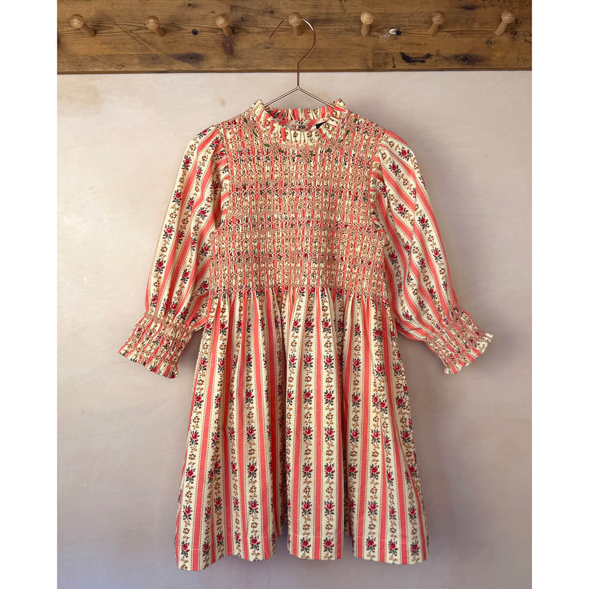 Handsmock Dress by Bonjour. Bonjour's iconic handsmock style in a longer length dress. An exclusive style for us this season, in the beautiful pink tapestry fabric, with pink smocking and embroidered flowers.