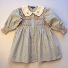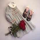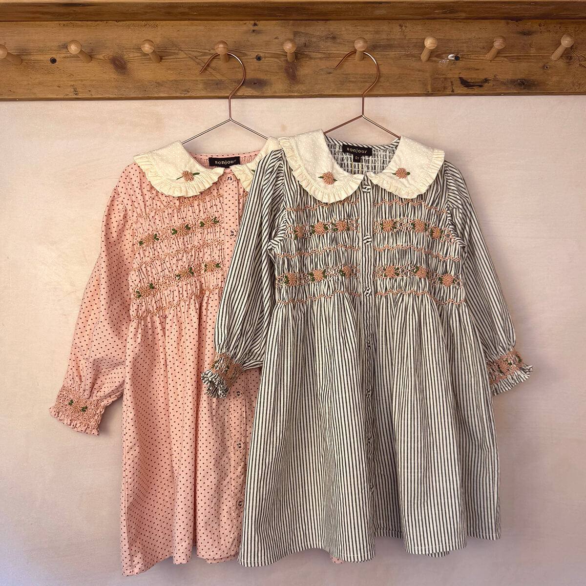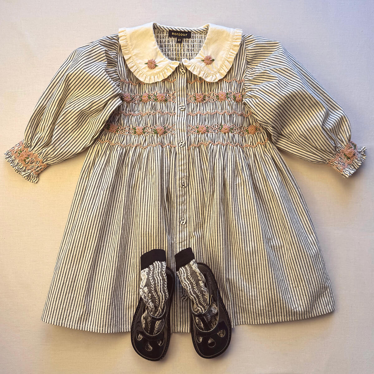Romantic Tunique Dress by Bonjour. In black and ivory stripes, the Tunique dress has hand embroidered pink flowers and embroidery and a contrast ivory ruffled collar with flower details. A chic, easy-to-wear style that's perfect with Bonjour's coordinating socks on Autumn days, or layer with woolly tights and cardigans on cooler Winter days.