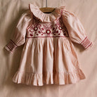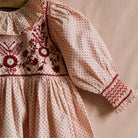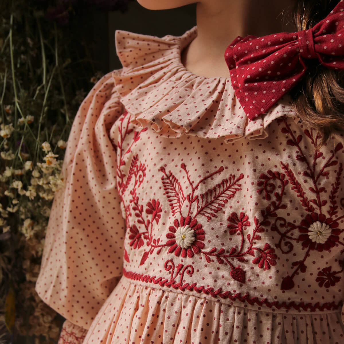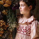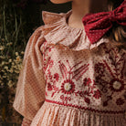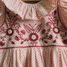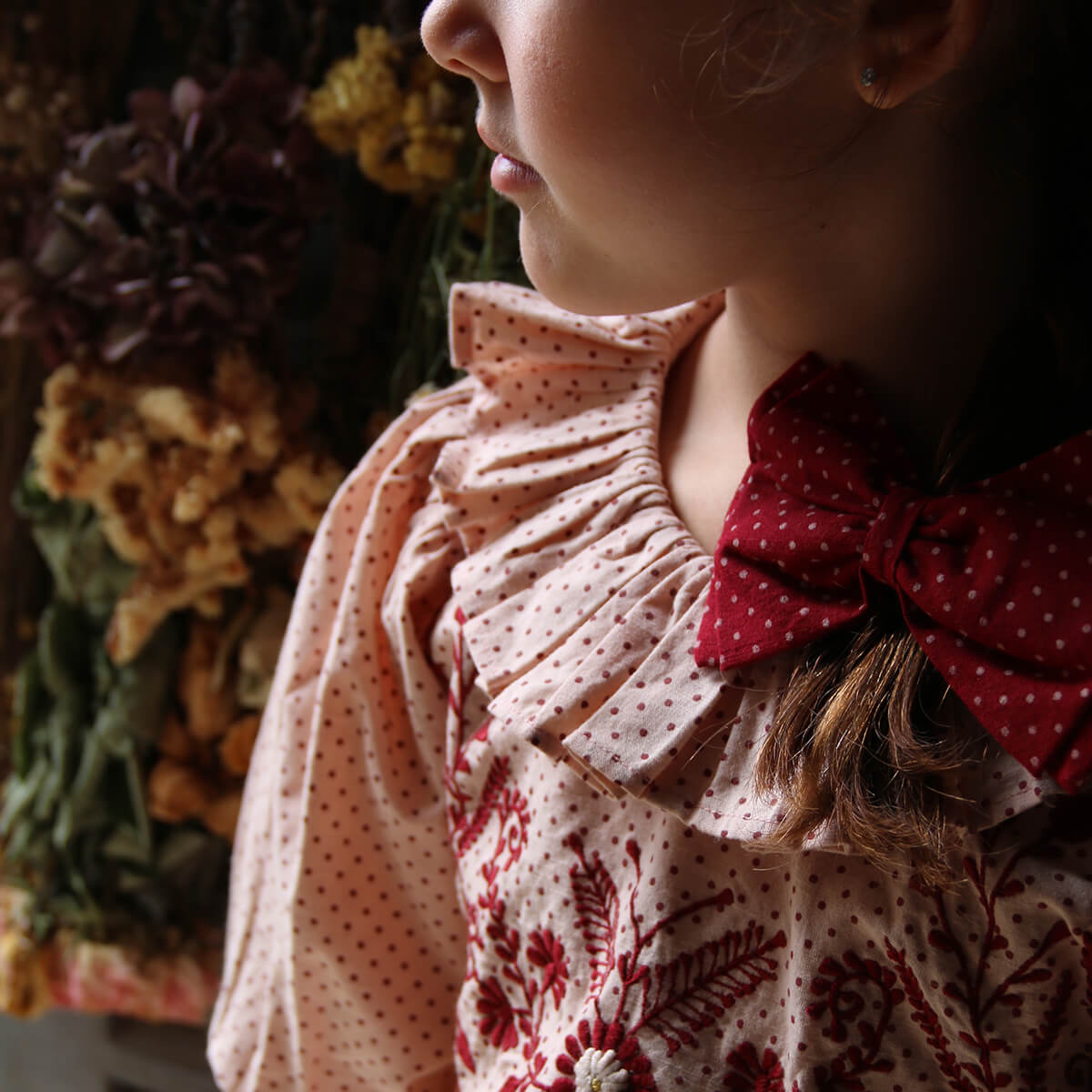 Iris Tunique by Bonjour. Long sleeved blouse with a ruffle collar, shirring details on the cuffs and embroidered smock.