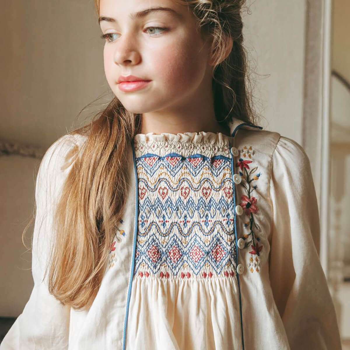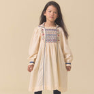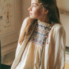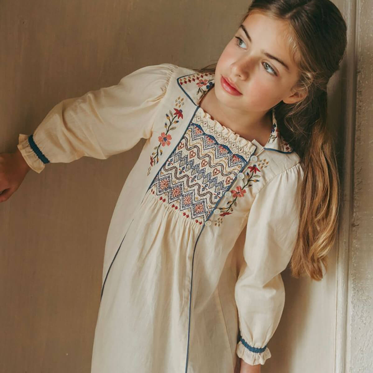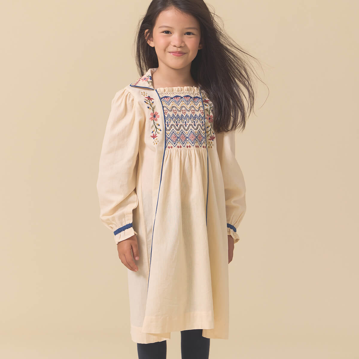 Isla Dress by Lali. Pretty embroidery traces the bodice and collar, adding quiet charm to its vintage-inspired silhouette. Thoughtful and timeless, it’s a piece made for cozy celebrations and snow-dusted mornings.