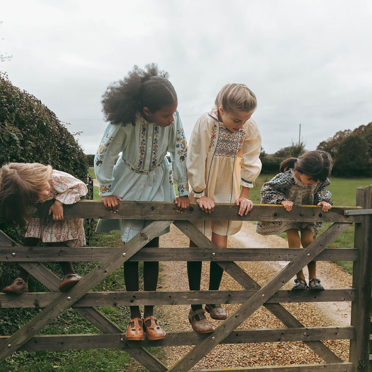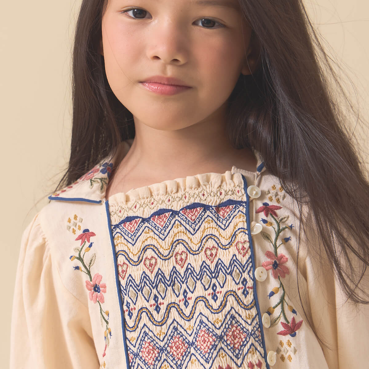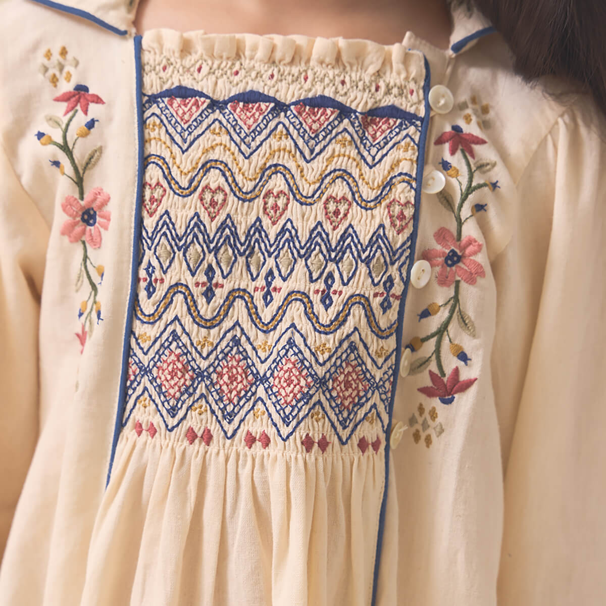 Isla Dress by Lali. Pretty embroidery traces the bodice and collar, adding quiet charm to its vintage-inspired silhouette. Thoughtful and timeless, it’s a piece made for cozy celebrations and snow-dusted mornings.