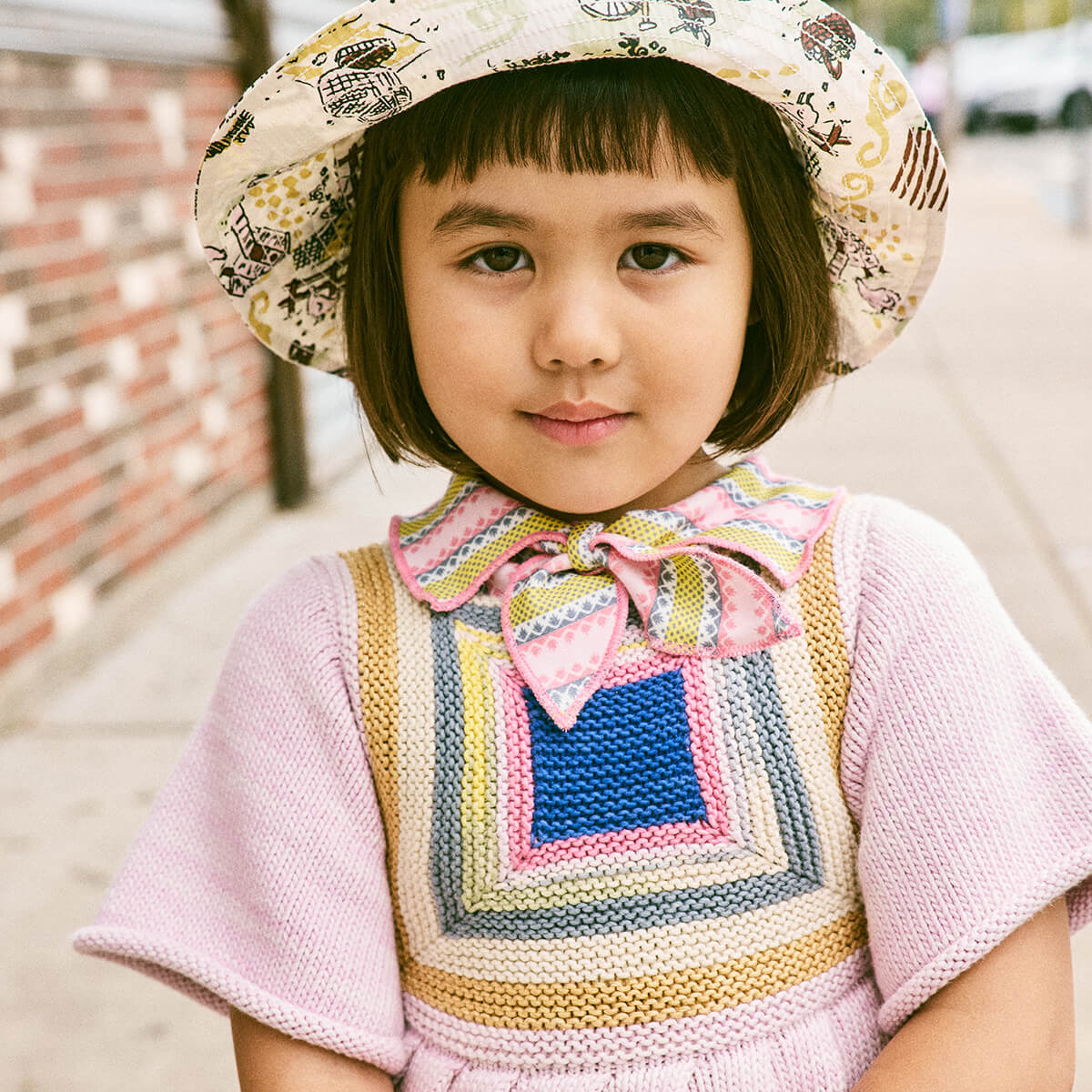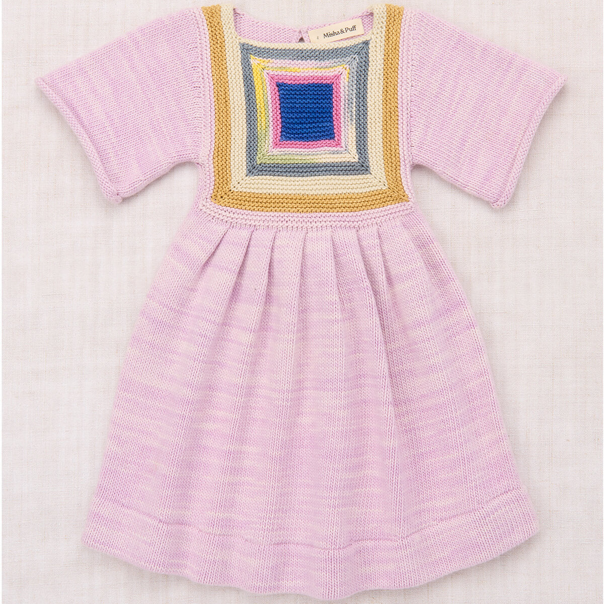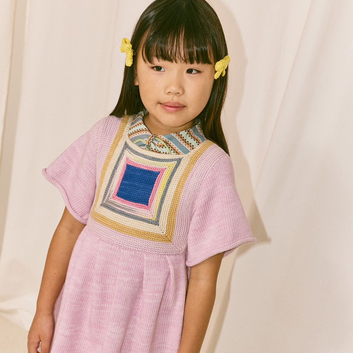 Log Cabin Dress by Misha & Puff. Inspired by log cabin technique, a dress in a Pima cotton knit, featuring a hand-knit geometric motif, square neckline, gathered waist, sleeves with rolled edges, and corozo button keyhole closure at the back neck.