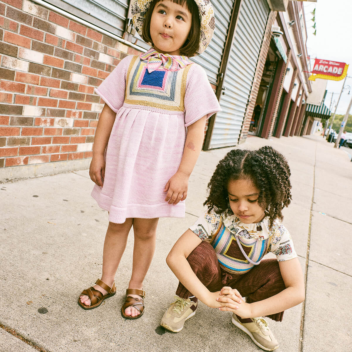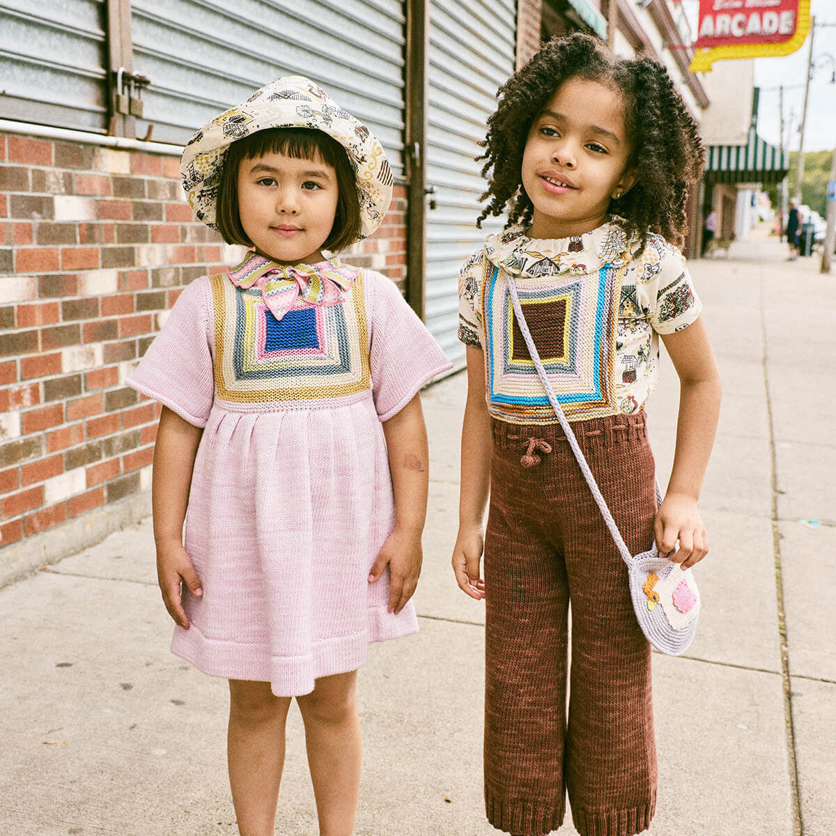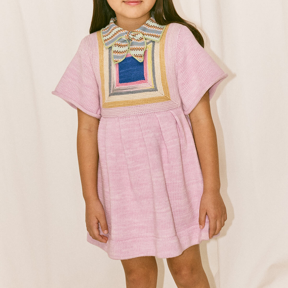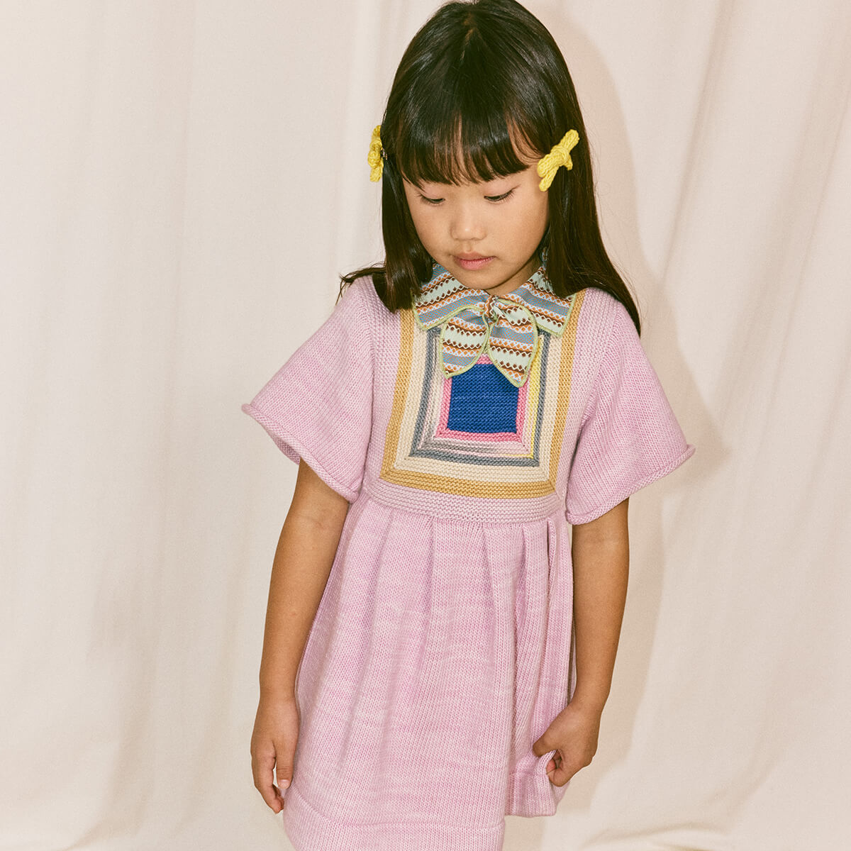Log Cabin Dress by Misha & Puff. Inspired by log cabin technique, a dress in a Pima cotton knit, featuring a hand-knit geometric motif, square neckline, gathered waist, sleeves with rolled edges, and corozo button keyhole closure at the back neck.