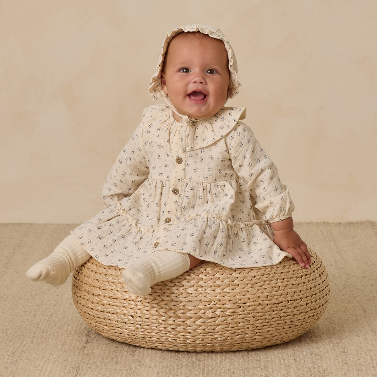 Dress by Quincy Mae. This tiered long sleeve dress features a sweet ruffle collar and button down front for an effortlessly charming look. Coordinating bloomers included with sizes 3-6M - 2-3Y.