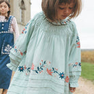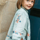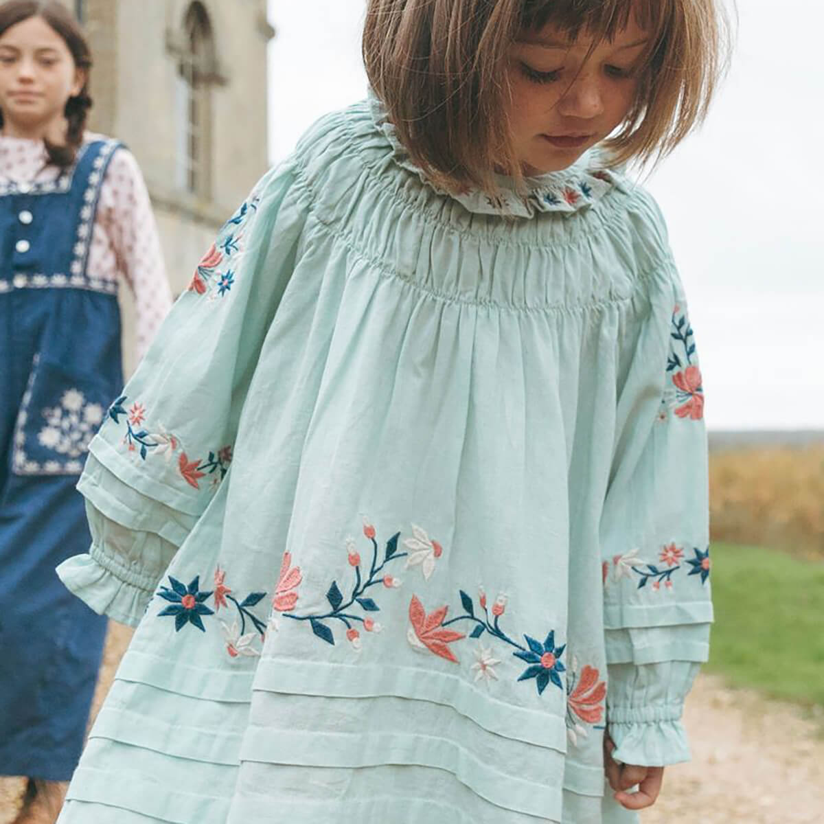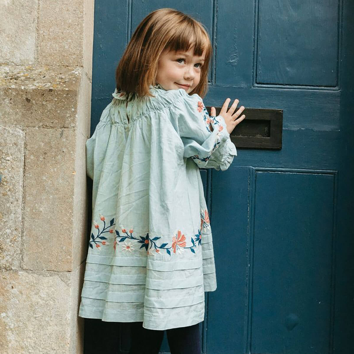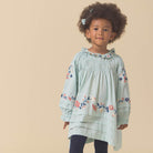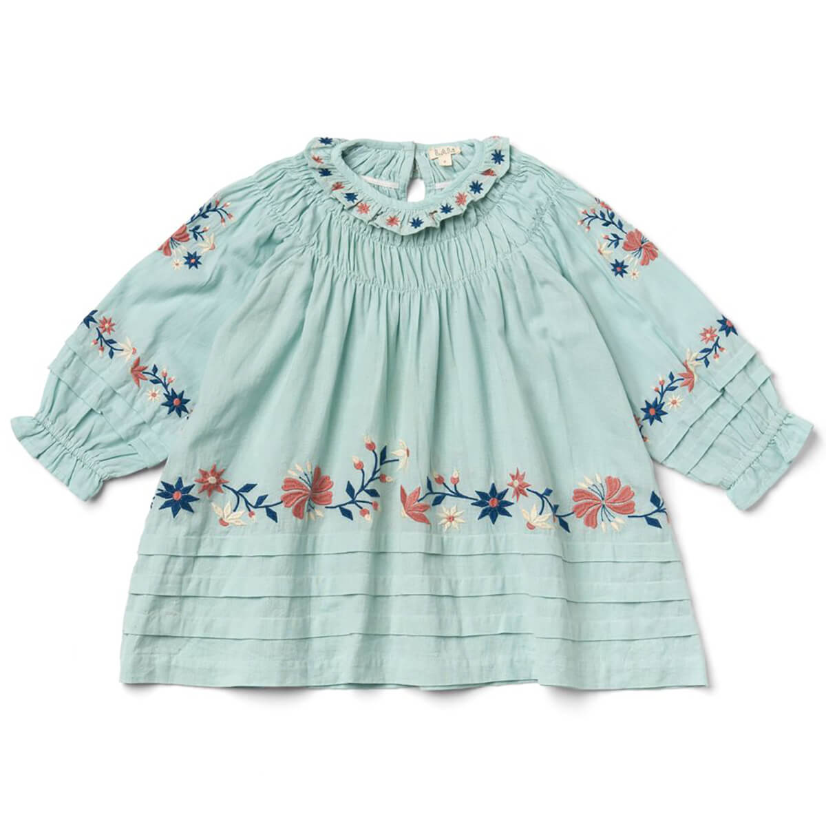 Tulip Dress by Lali. Introducing the Tulip Dress in Blue Haze. The Tulip, a staple in every Lali wardrobe, has been reimagined with playful pin tucks in the sleeves and at the hem. Gentle elastic at each long sleeve creates a sweet ruffle at each wrist. The Tulip also includes floral embroidery at the hem of the dress, sleeves, and around the pretty ruffled collar.