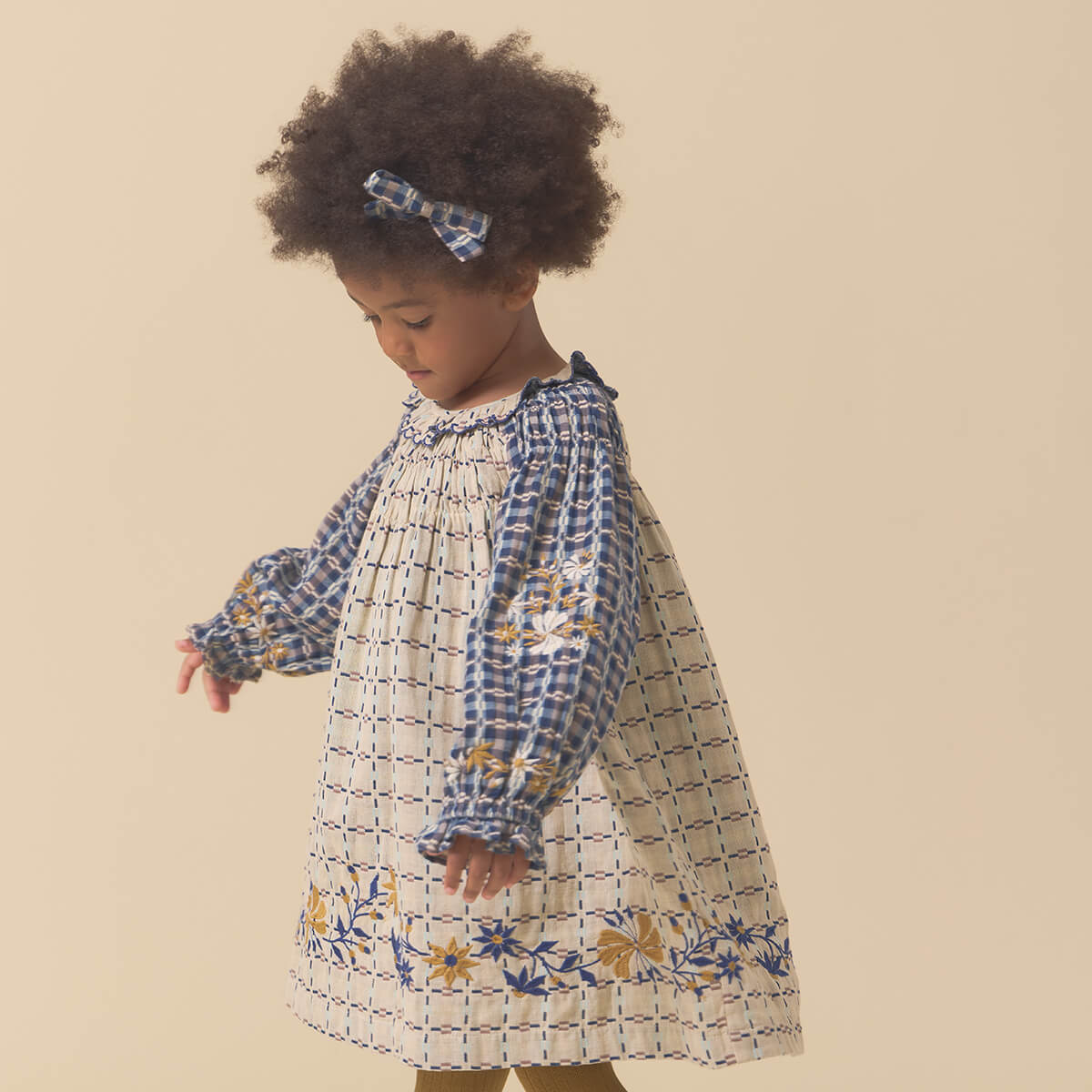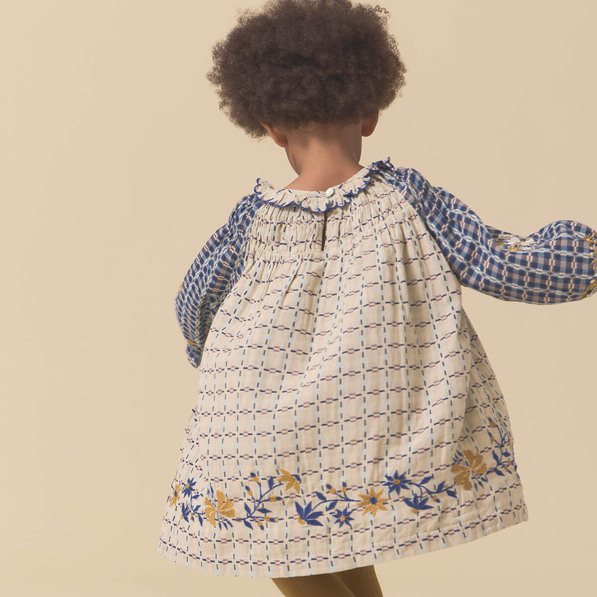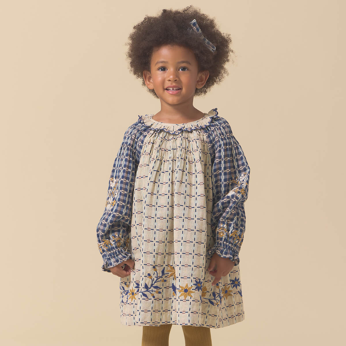 Tulip Dress by Lali. A beloved silhouette returns—this time in Lali's custom double-sided fabric, inspired by vintage Indian woven blankets. The textured weight and warmth make it perfect for crisp fall days, while the clever use of both sides of the fabric creates playful color-blocking throughout. Finished with cheerful embroidery, this dress is cozy, nostalgic, and full of whimsy—sure to become your little one’s favorite.