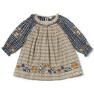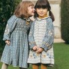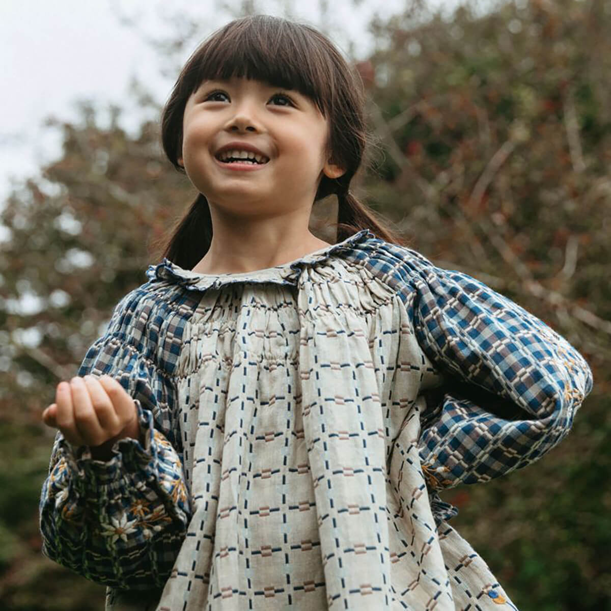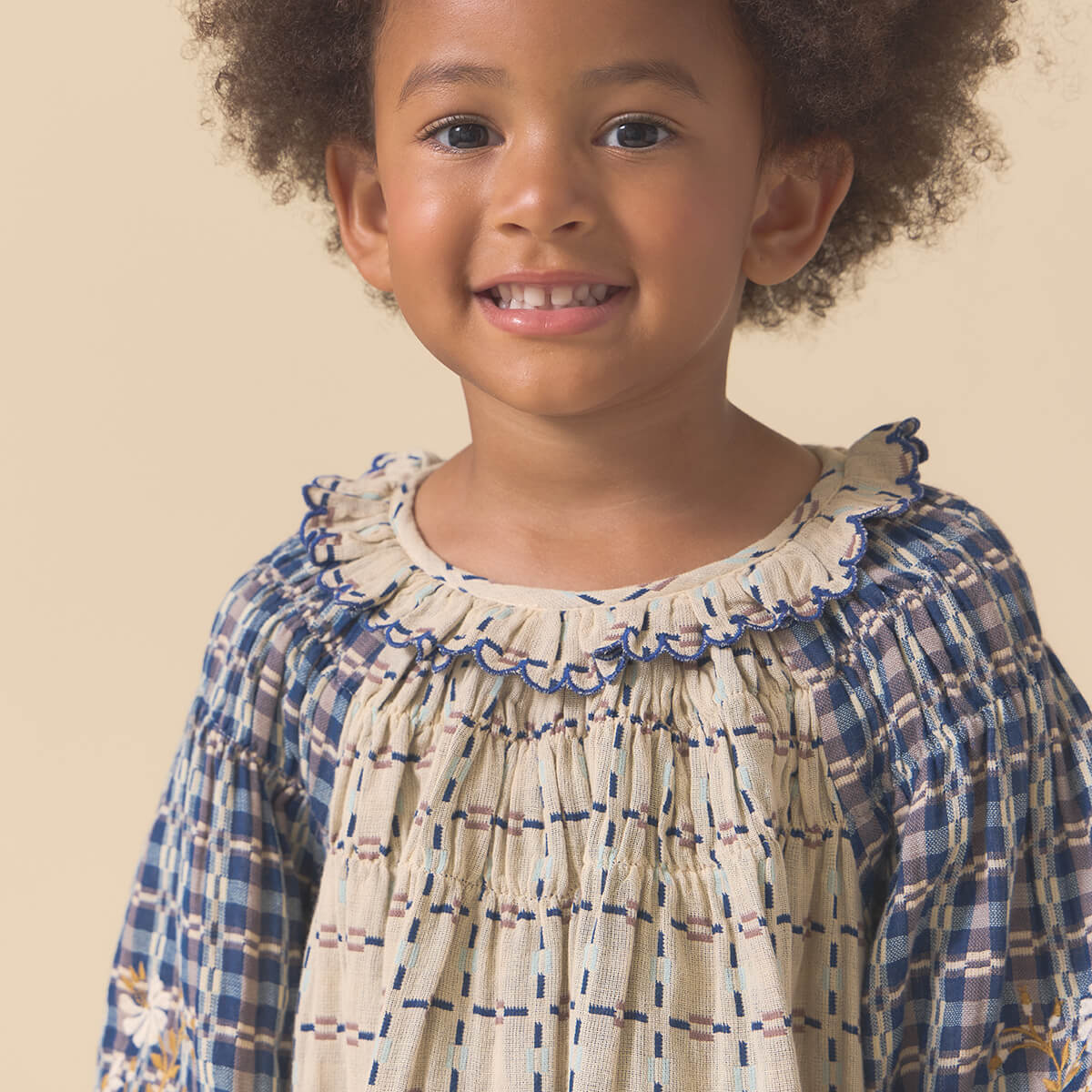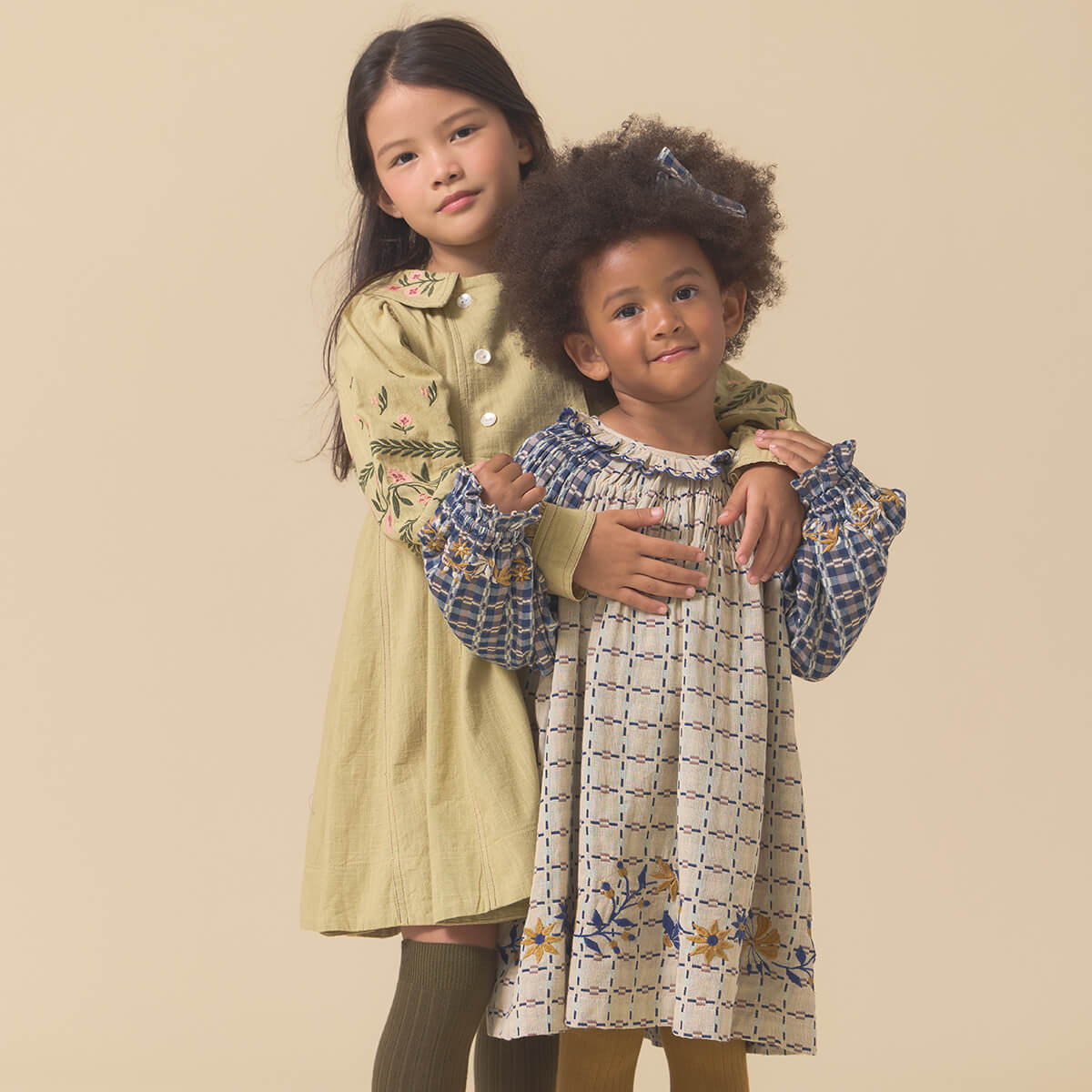 Tulip Dress by Lali. A beloved silhouette returns—this time in Lali's custom double-sided fabric, inspired by vintage Indian woven blankets. The textured weight and warmth make it perfect for crisp fall days, while the clever use of both sides of the fabric creates playful color-blocking throughout. Finished with cheerful embroidery, this dress is cozy, nostalgic, and full of whimsy—sure to become your little one’s favorite.