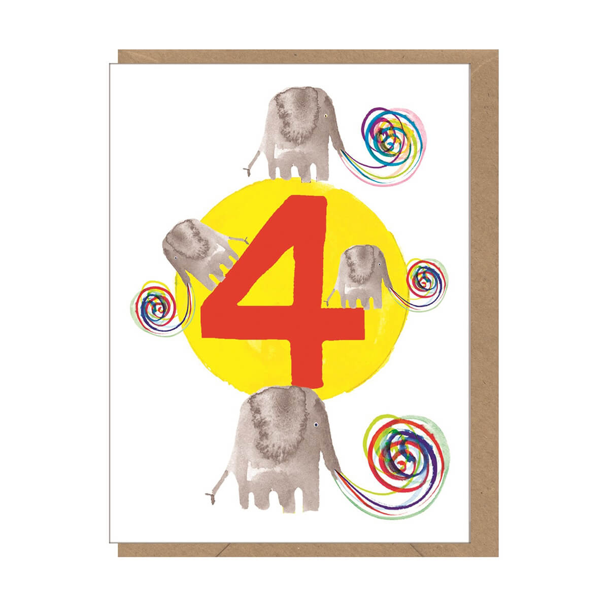 Age 4 Elephants mini greetings card by Earlybird Designs.  Features a watercolour illustration by Dominic Early.  Blank inside with kraft envelope.