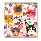 Kitsch Cats Birthday greetings card by Earlybird Designs. This square card features a vibrant and colourful illustration from the Buddy and Betty card collection by Emma Jayne Designs. Blank inside with kraft envelope.