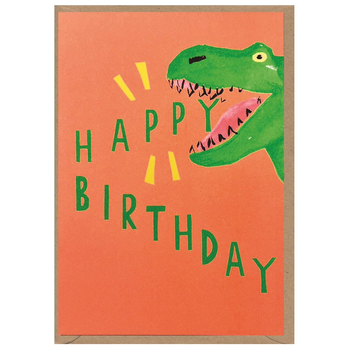 Neon Birthday Dinosaur greetings card by Earlybird Designs. From the Fab Neon card collection by Dominic Early. Blank inside with kraft envelope.