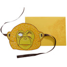 Monkey mask greetings card by East End Press. Hand printed greetings card printed and cut in the shape of a Monkey's face. The card is made from thick recycled paper with pre-cut eye holes, and ribbon either side so the greeting card can be used as a mask. Printed on the front with a blank reverse for the sender's message. The card comes complete with a hand printed coloured envelope with a monkey motif, to create a truly luxurious and special card.