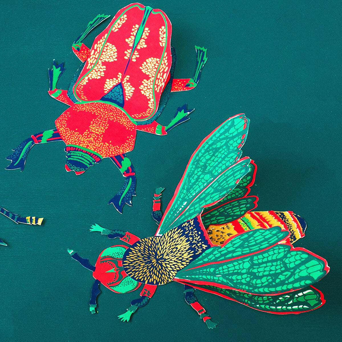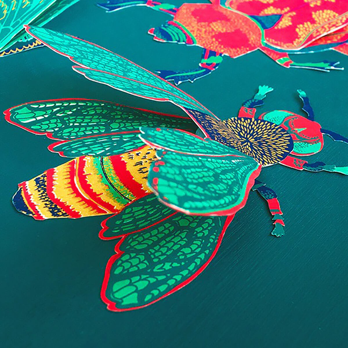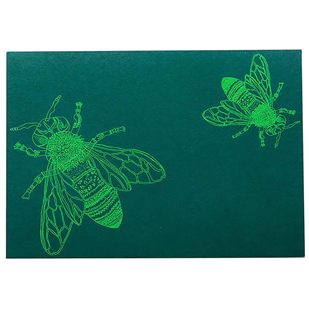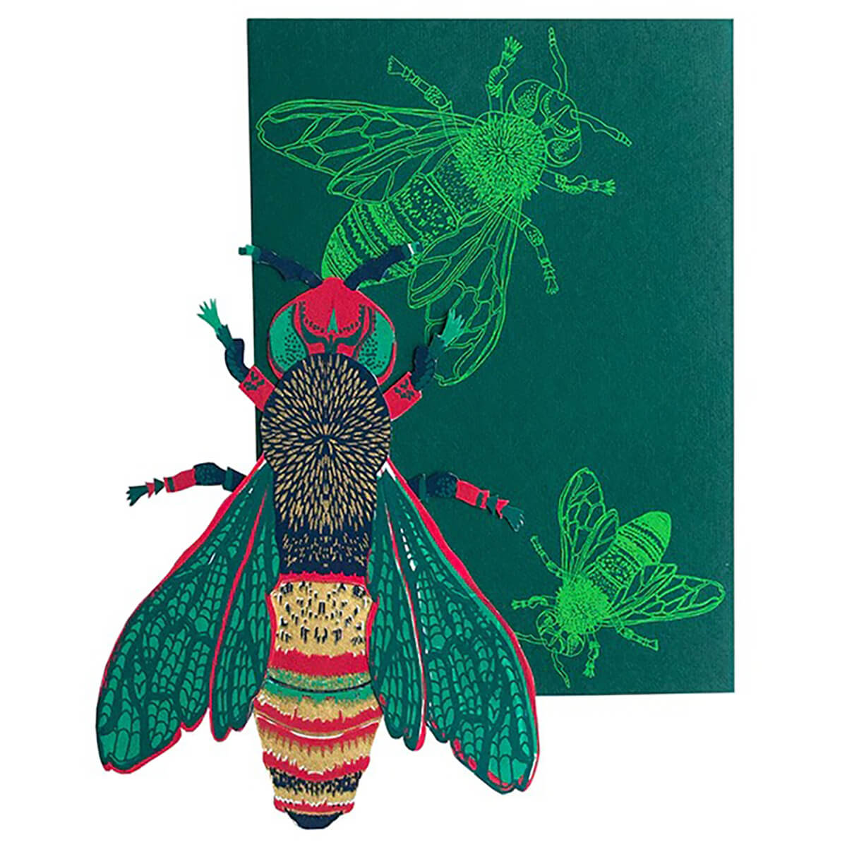 Wasp shaped greetings card by East End Press. Hand printed shaped greetings card featuring a striking and detailed wasp illustration printed on both sides using high quality, uncoated paper. Suitable for a variety of occasions, this card contains a 'hidden' cream coloured message space beneath the wings for the sender to personalise as they wish. The card comes complete with a matching hand printed coloured envelope with an insect motif, to create a truly luxurious and special card.
