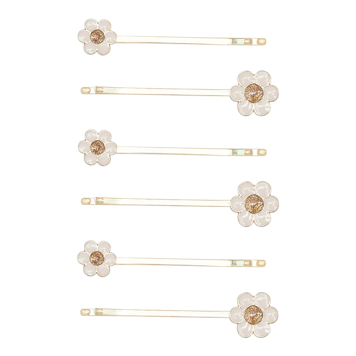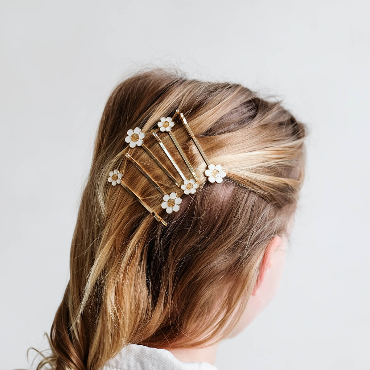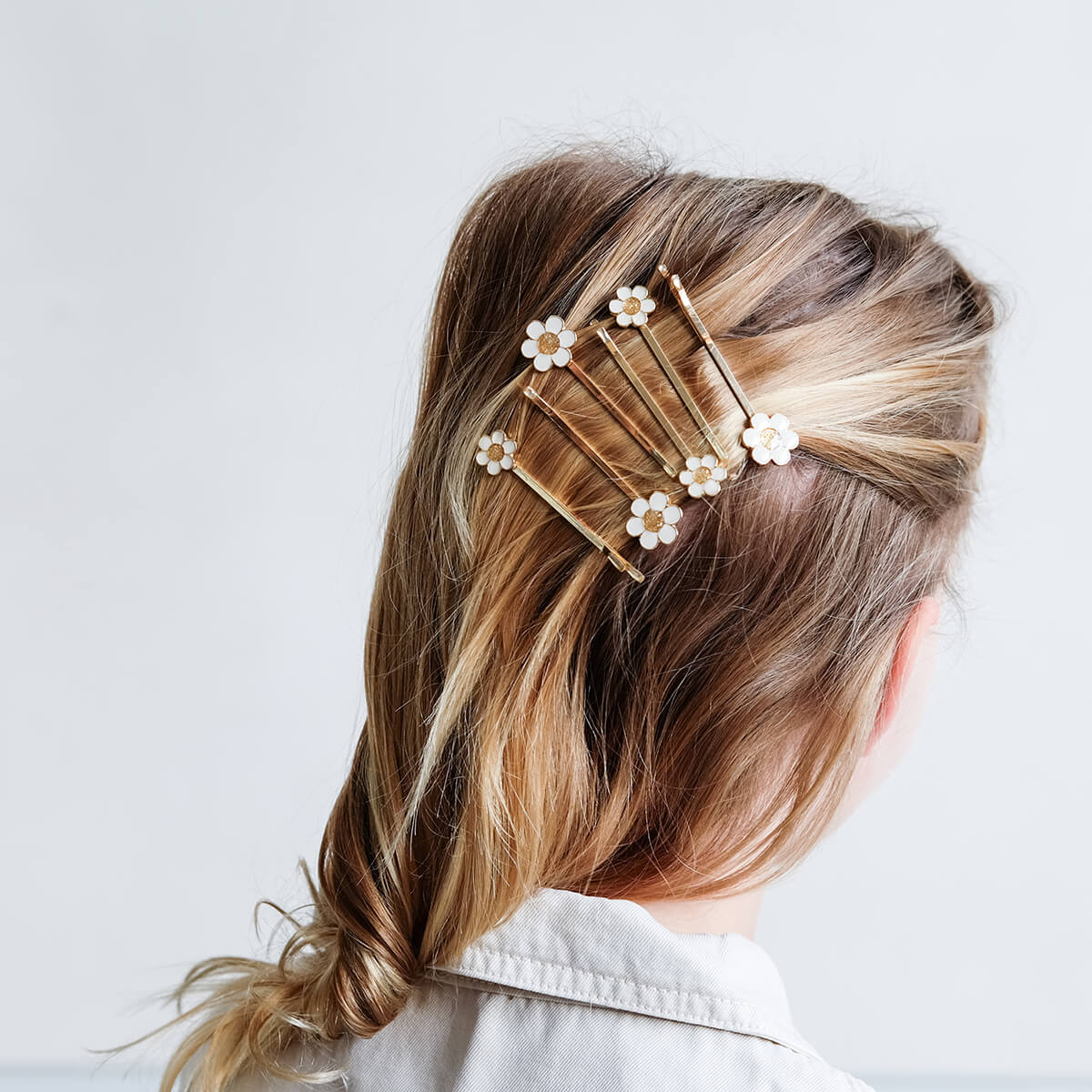 Daisy Enamel Kirby Hair Grips by Mimi & Lula. This beautiful pack of pearly little daisy grips are perfect for springtime styling. Ideal for keeping back thicker hair, these grips would look lovely for a special occasion too. Featuring pearly white enamel daisies with gold glitter centres.