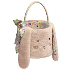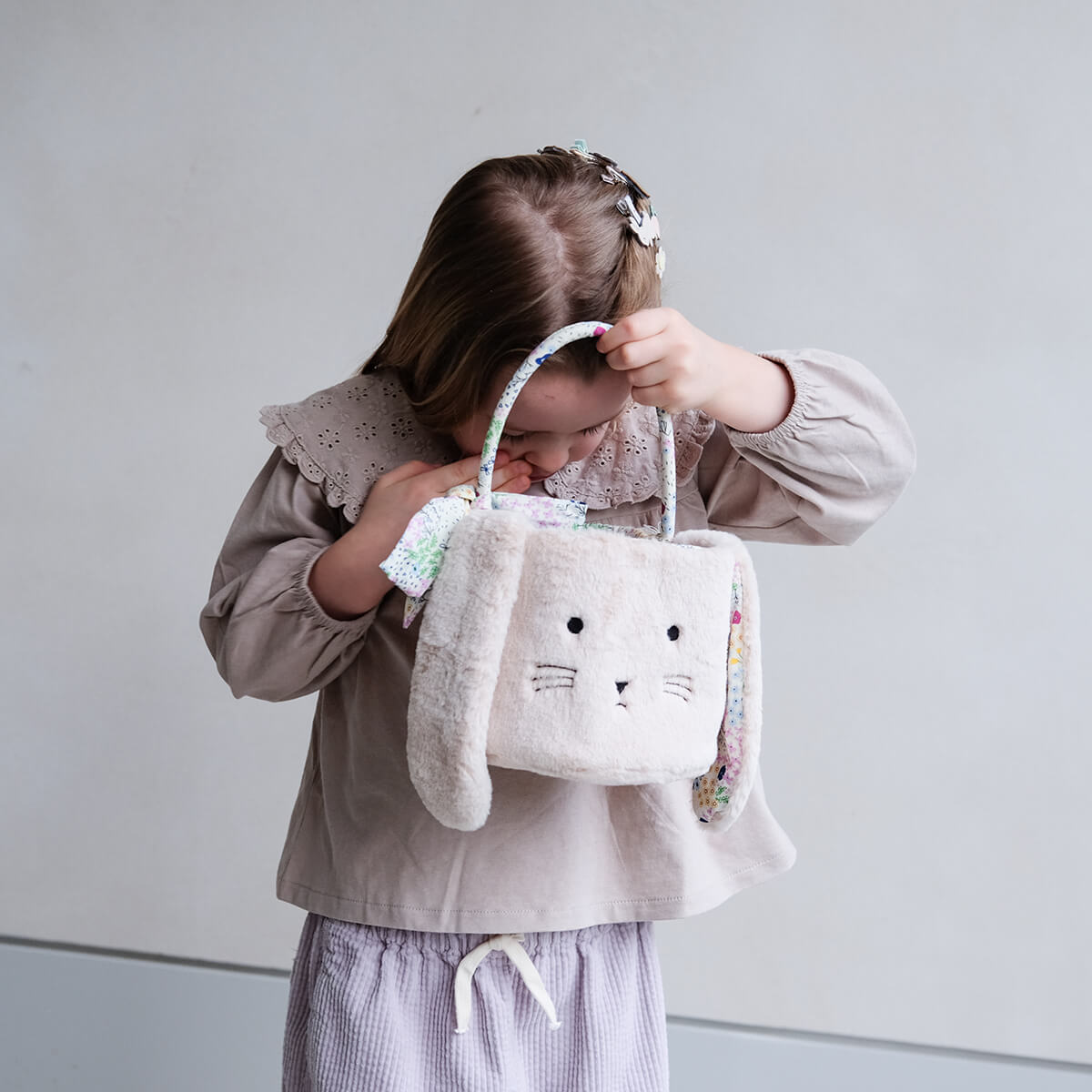 Crafted from the softest, floral lined fur fabric complete with floppy ears, carry handle and hand tied bow with a sweet embroidered bunny face and a pom pom tail.