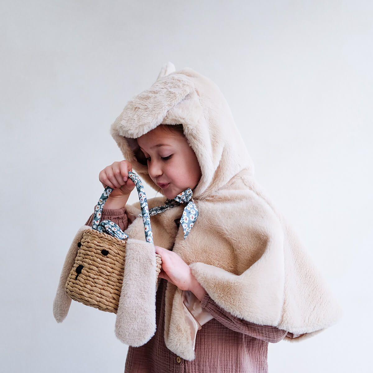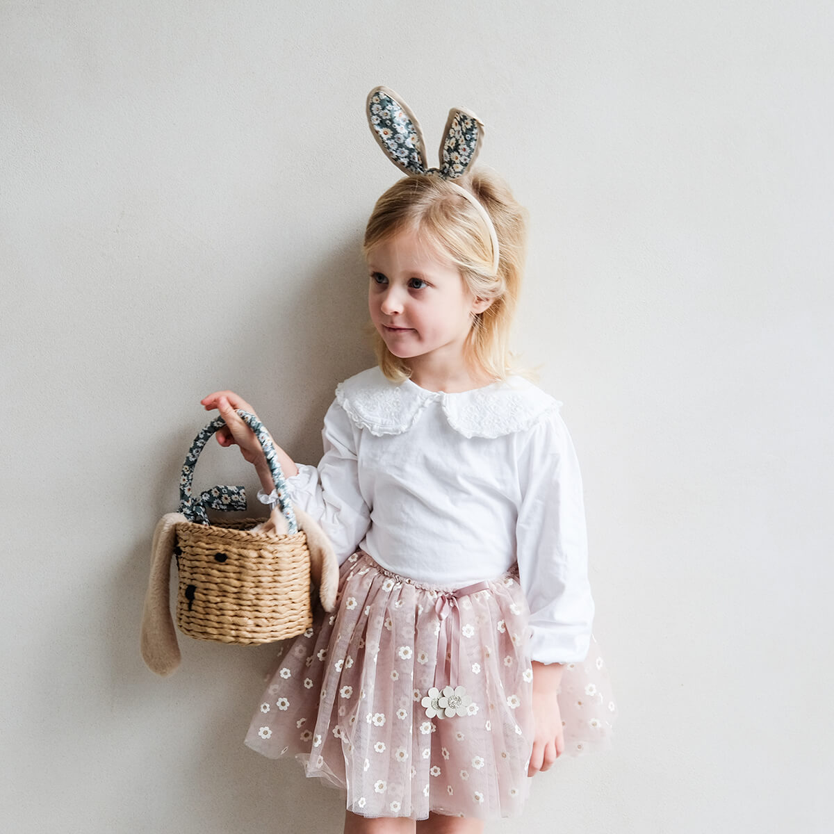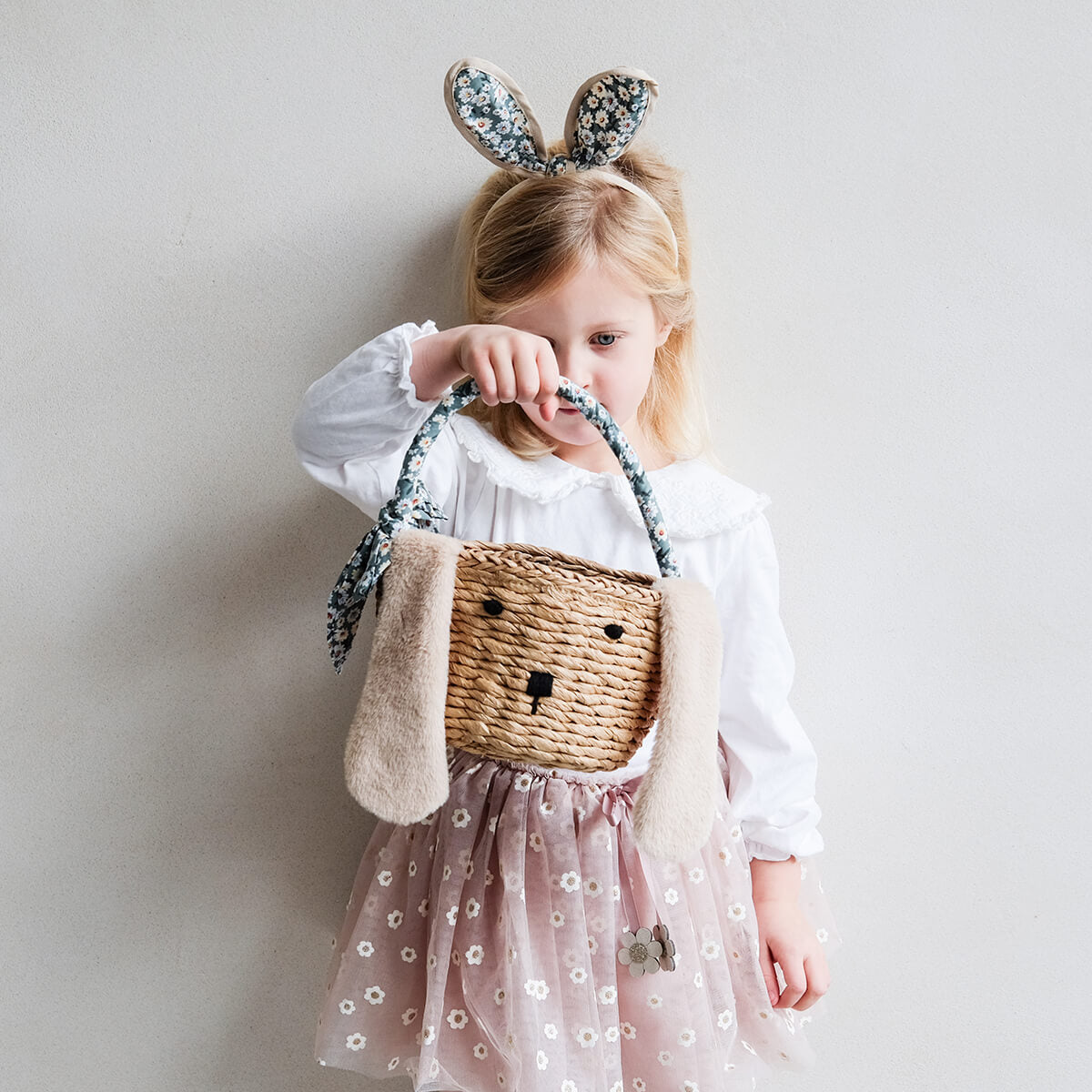 Spring Easter basket by Mimi & Lula. This adorable woven Easter basket features the sweetest stitched little bunny face with the softest fluffy ears, a super cute floral print lining and is topped off with a beautiful bow detail. This basket would make the perfect Easter gift and is ideal for an egg hunt, ready to be filled to the brim with eggs and Easter treats! It is lovely as an Easter basket or for any special occasion.