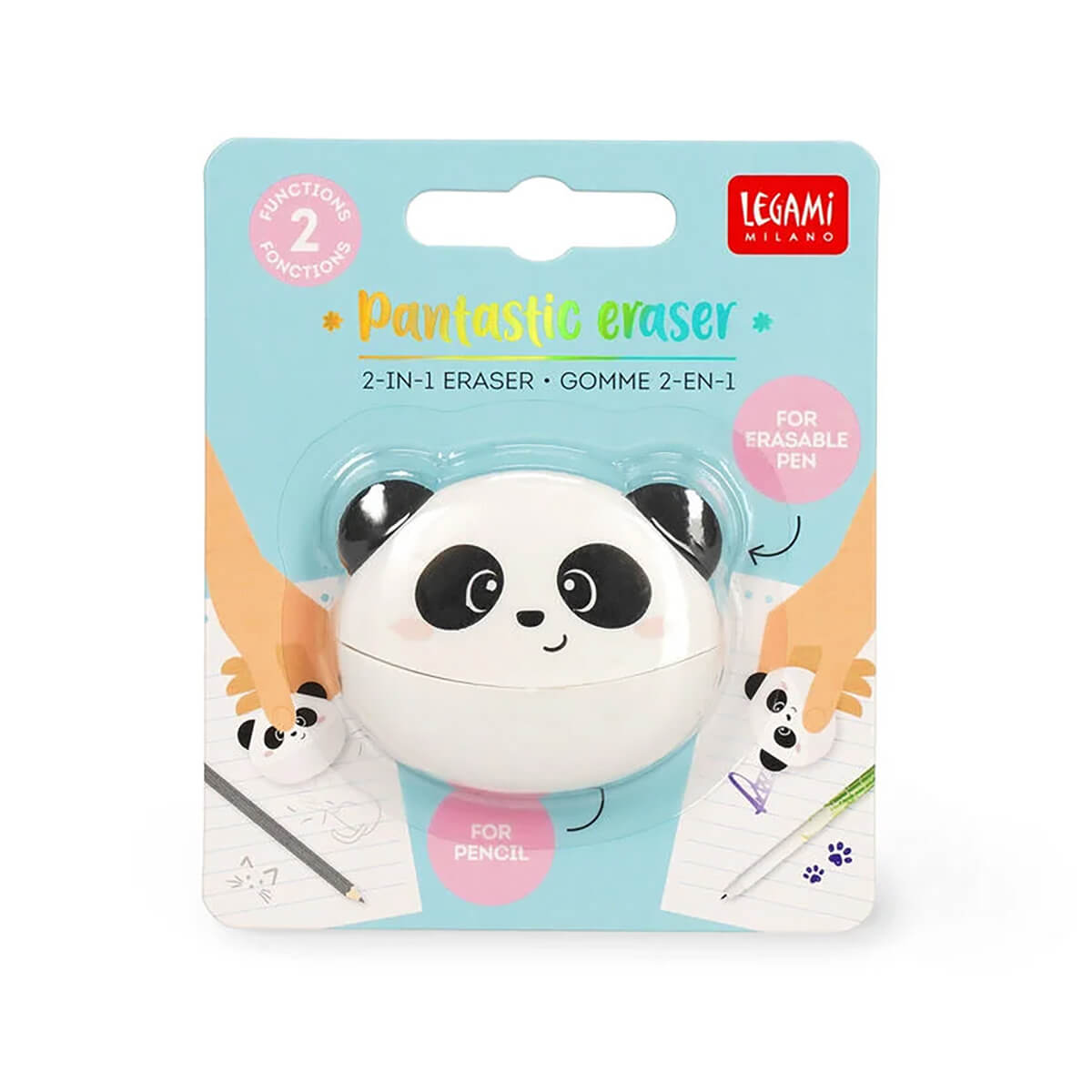 Pantastic 2-In-1 Eraser by Legami. One panda, two powers: if there are no mistakes in sight, it's because they've been erased by the 2-in-1 Eraser - Pantastic Eraser from Legami. One side erases pencil, the other erases pen. And when it looks this cute, you'll want to make mistakes just so you can use it! Dual function: erases pencil and erasable ink.