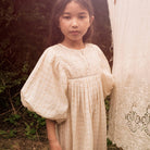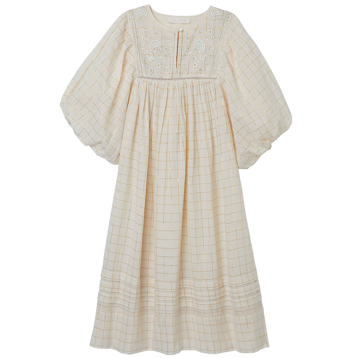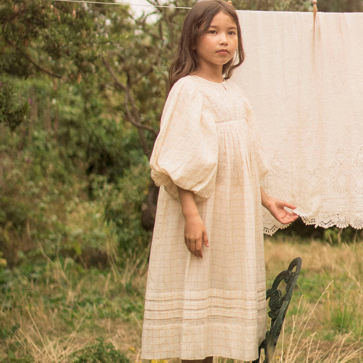 Jolie dress by Faune. The Jolie dress is in a beautiful cotton with a gold lurex woven check. The front neck yoke is adorned with an intricate embroidery. This is truly fabulous dress with stand out puff sleeves adding a more modern edge. Jolie will take you through the summer months and beyond and will be the perfect holiday and party dress.