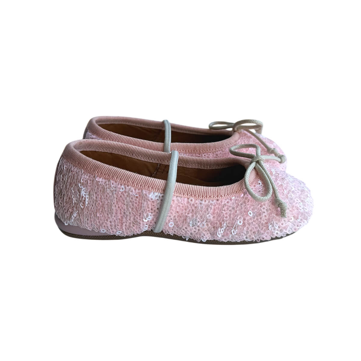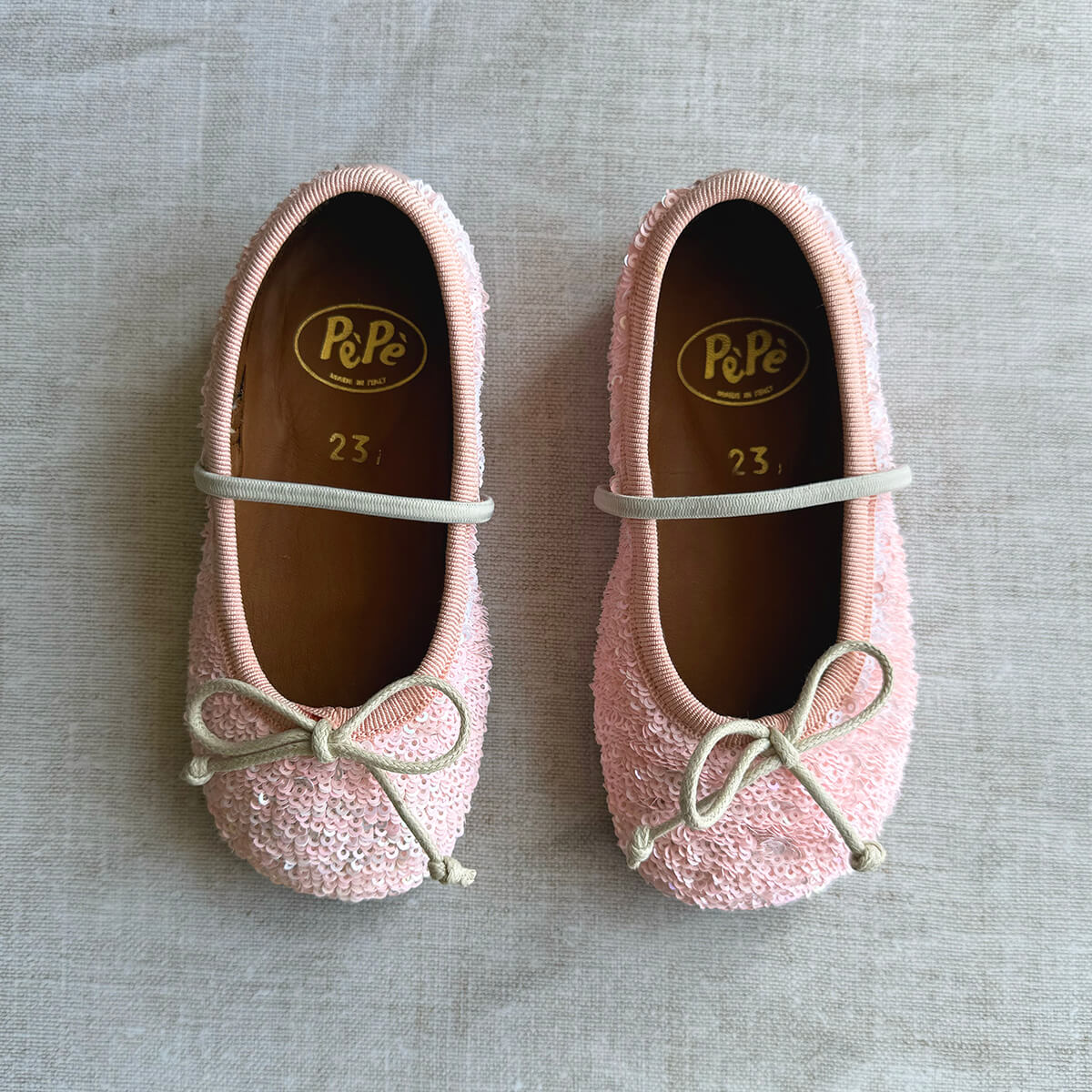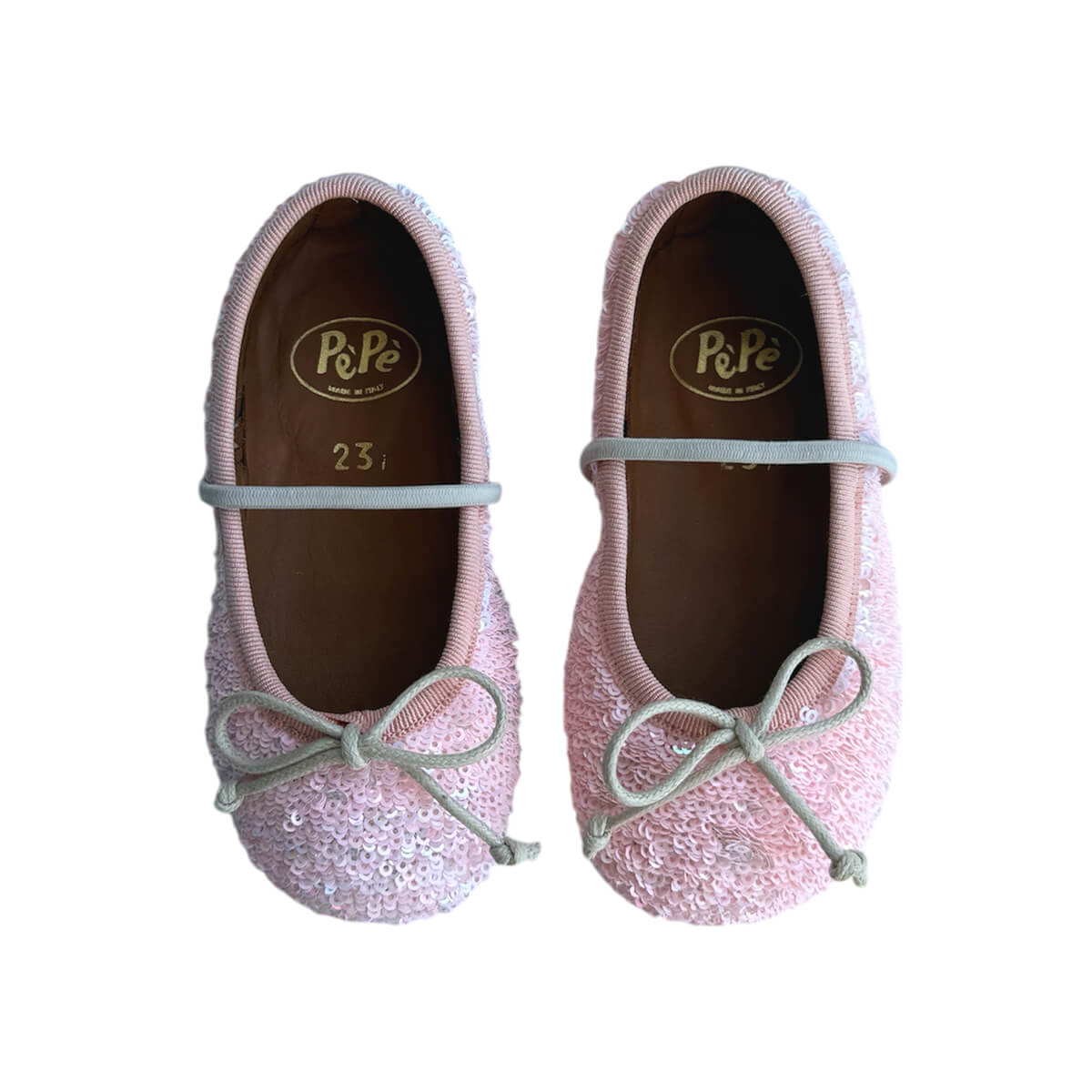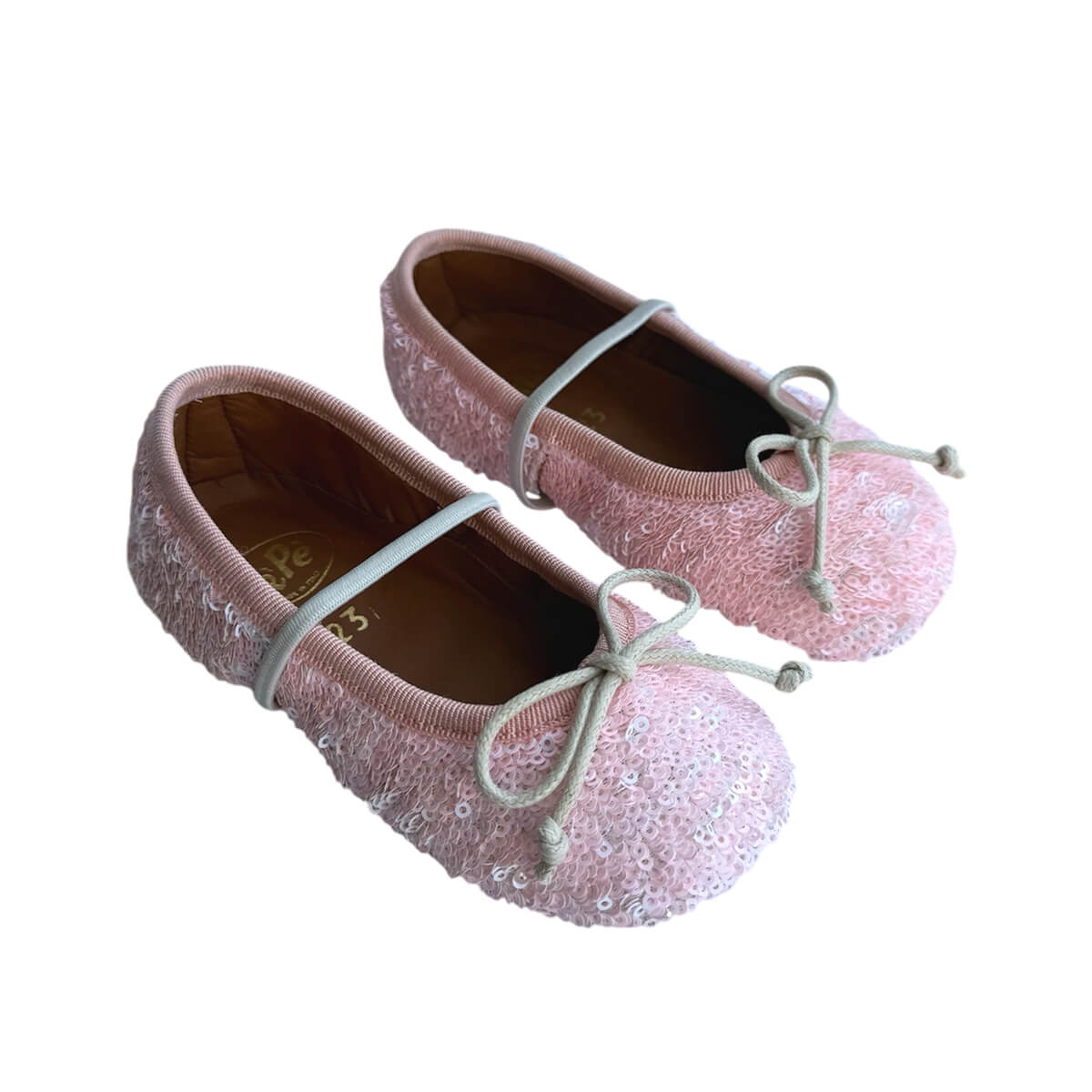 Darlyn ballet slippers by PèPè shoes. Soft pink sequinned ballet slippers with a leather lining and rubber sole. Elastic strap. Handmade using traditional methods in Italy.