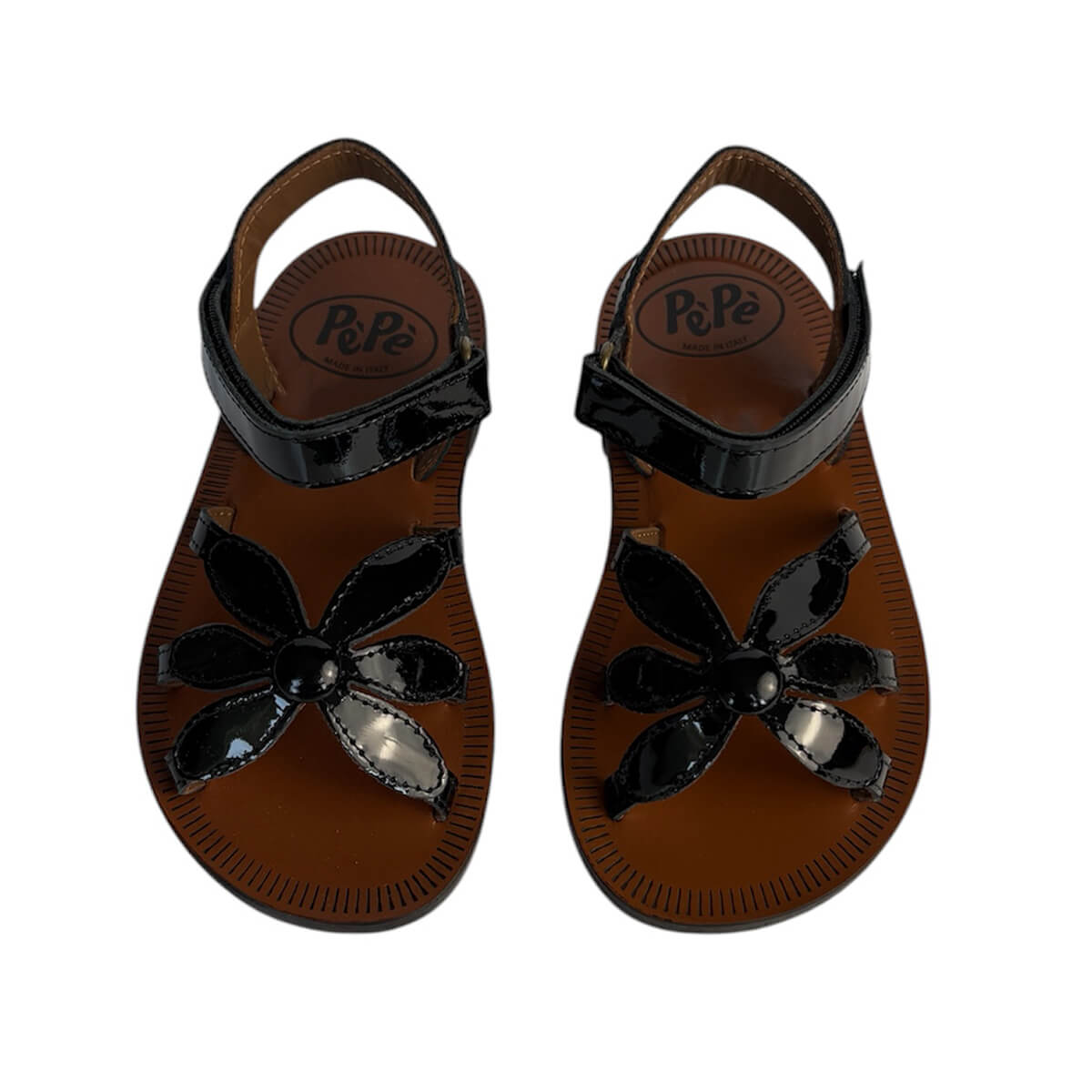 Giulia Flower sandals by PèPè shoes. Flower front sandals in a shiny patent black leather with adjustable velcro ankle strap fastening. Soft and flexible leather sole. Lined with 100% leather. Handmade using traditional methods in Italy.