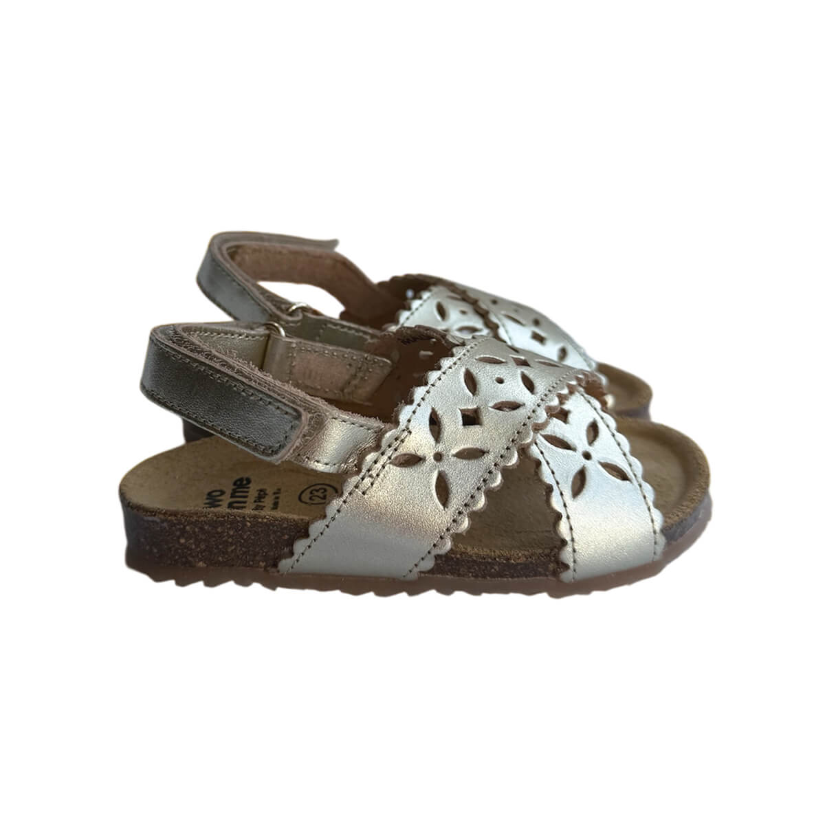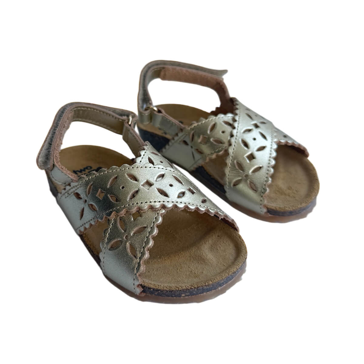 Ida crossover sandals by PèPè shoes. Two Con Me sandals in a vegetally tanned metallic gold leather with cut out front cross straps and adjustable velcro sling back strap fastening. Soft and flexible anatomical cork and rubber sole. Sole lined with 100% suede leather. Handmade using traditional methods in Italy.