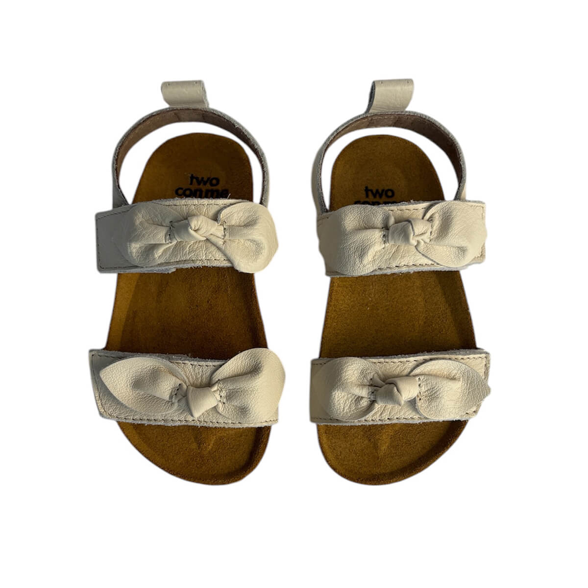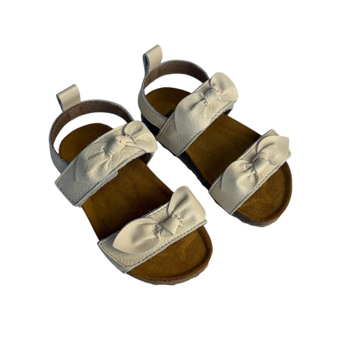 Sandy velcro sandals by PèPè shoes. Two Con Me sandals in a vegetally tanned cream leather with leather bow details on the straps. Velcro fastenings and a pull tab at the back for putting the shoe on easily. Soft and flexible anatomical cork and rubber sole. Sole lined with 100% suede leather. Handmade using traditional methods in Italy.