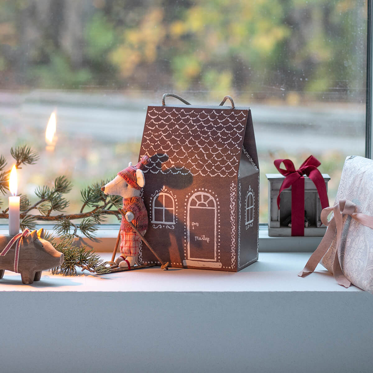 Gingerbread house gift bag by Maileg.  A paper bag shaped like a small gingerbread house. This is the perfect giftwrap for any small Maileg gift and will ensure the story will start before the gift is opened. Perfect for popping in any of the Maileg mice, bunnies or friends.  Could also be used for arts and crafts or role play.