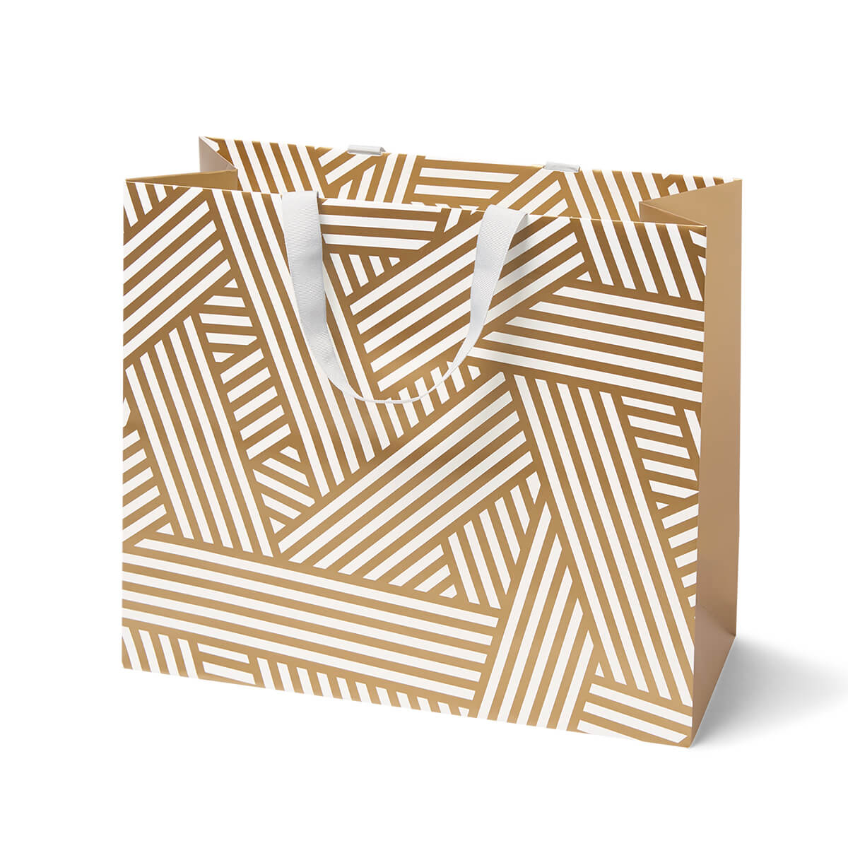 Ushaia large gift bag by Lagom Design.  Features a simple design by Kelly Hyatt, with metallic gold gift tag and a white fabric handle.  The perfect gift bag for a chic baby shower or newborn gift.  Easily fits in a baby outfit, small toy or similar gift.
