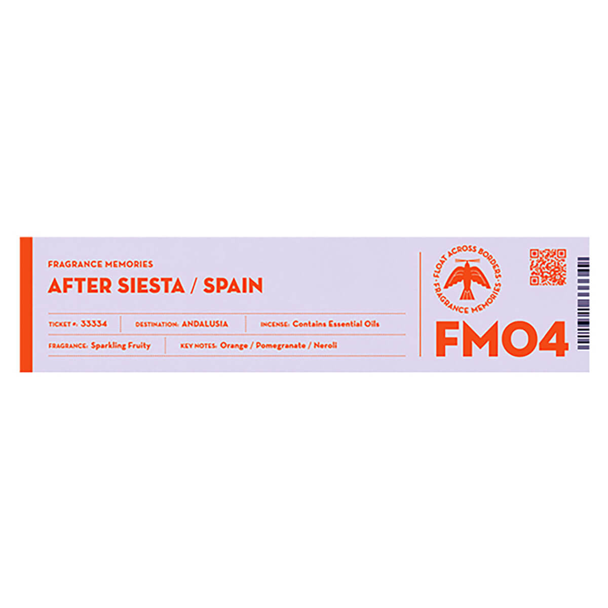 After Siesta / Spain FMO4 Fragrance Memories Incense by Nippon Kodo. Experience a tranquil afternoon in sun-soaked Andalusia, where the golden light lingers and time slows after a restful siesta. This fresh and vivid scent captures the warmth of the Spanish sun and the soft sweetness of the moment with a vibrant blend of citrus and fruit. Includes 15 incense sticks and a mini ceramic incense holder.