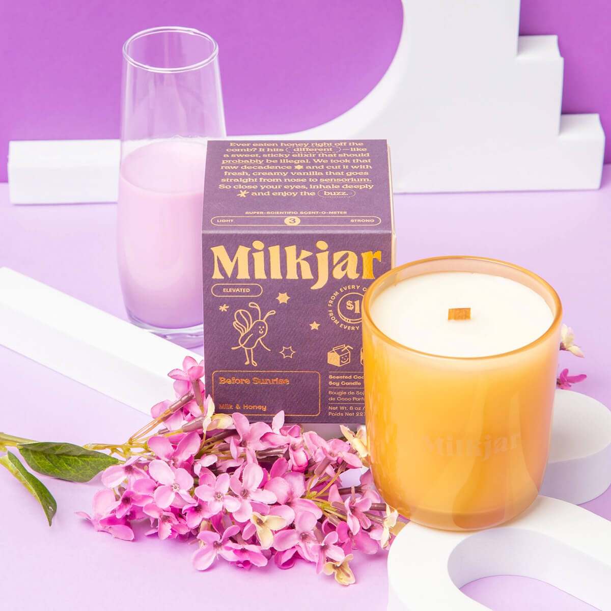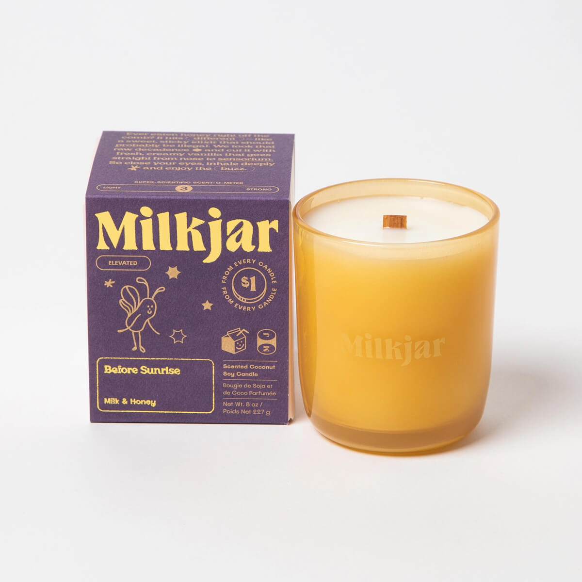 Before Sunrise Milk & Honey Candle by Milk Jar. Ever eaten honey right off the comb? It hits different—like a sweet, sticky elixir that should probably be illegal. We took that raw decadence and cut it with fresh, creamy vanilla that goes straight from nose to sensorium. So close your eyes, inhale deeply and enjoy the buzz.